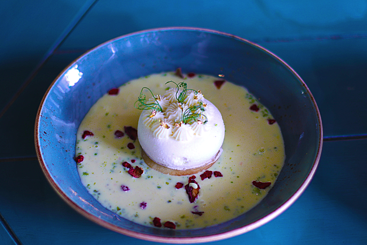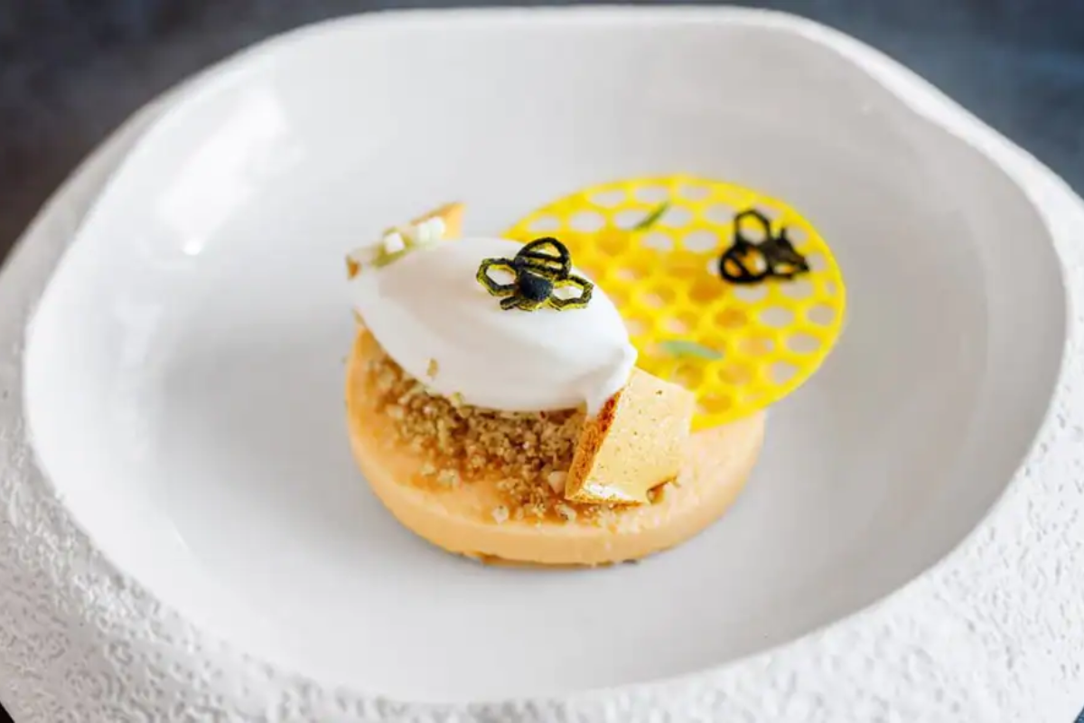 In chef Carmine's elegant signature dessert, the subtle flavors of creamy ricotta and chamomile crumb are combined with sweetness from a honey mousse. This treat was initially created to help Blossom Honey, a nearby farm in Dubai, and it is now one of the most popular dishes on the menu.