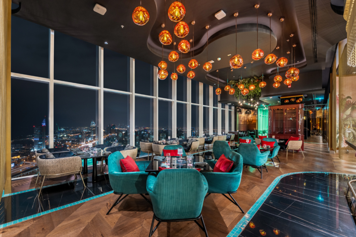 Hotel Cartagena is one of the two lively dining experiences that atop the towers of the JW Marriott Marquis. The eatery is styled on an eclectic hotel where trinkets from each guest are collected to add to the kitsch charm and has stylish interiors that are perfect for a chic sky-high location. Located on the 72nd floor of the tower, the window tables are the best spots to take in the breathtaking views, even though a restaurant further inside the space will leave you immersed in the live performance that rotate their way around the table. With its interior that resembles a rainforest and its panoramic views, this vibrant location was literally made for Instagram. Although the menu is loosely based on Latin food, it features influences from all over the world, including Jamaican spatchcock chicken, grilled seabass, and a variety of sushi rolls. Expect to eat foods like braised short ribs, spicy tuna maki rolls, and red snapper ceviche.