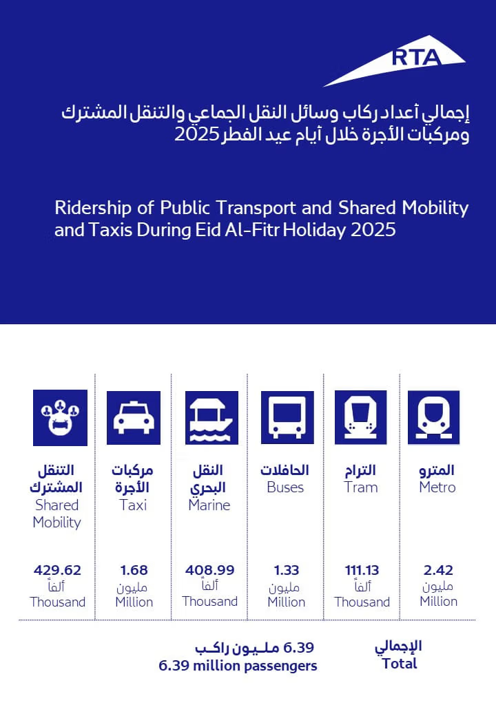 Dubai’s Roads and Transport Authority (RTA) has reported a total of 6.39 million passengers using public transport, taxis, and shared mobility services during the Eid Al-Fitr holiday from March 30 to April 1, 2025.