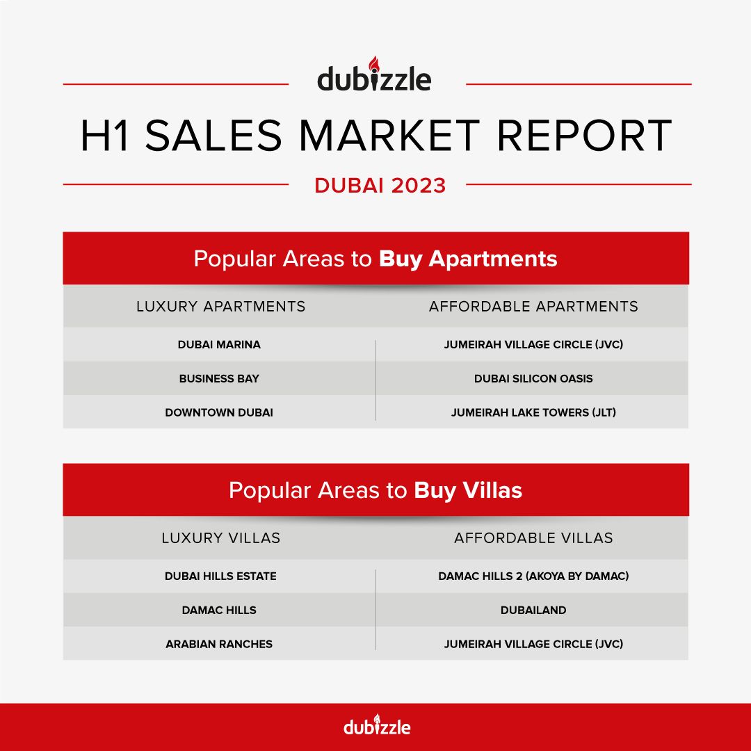 ● The average sales price of affordable and luxury apartments in the first six months of 2023 ranged between AED 466k to AED 5.45M.