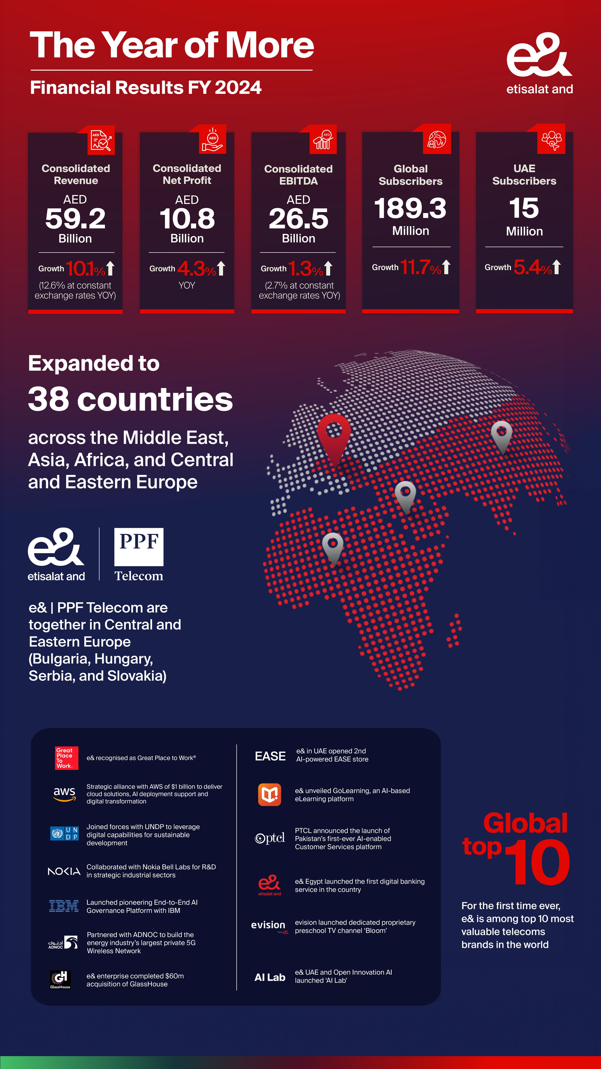 e& has achieved record financial performance in 2024, reporting a consolidated net profit of AED 10.8 billion, marking a 4.3% year-over-year (YoY) increase.