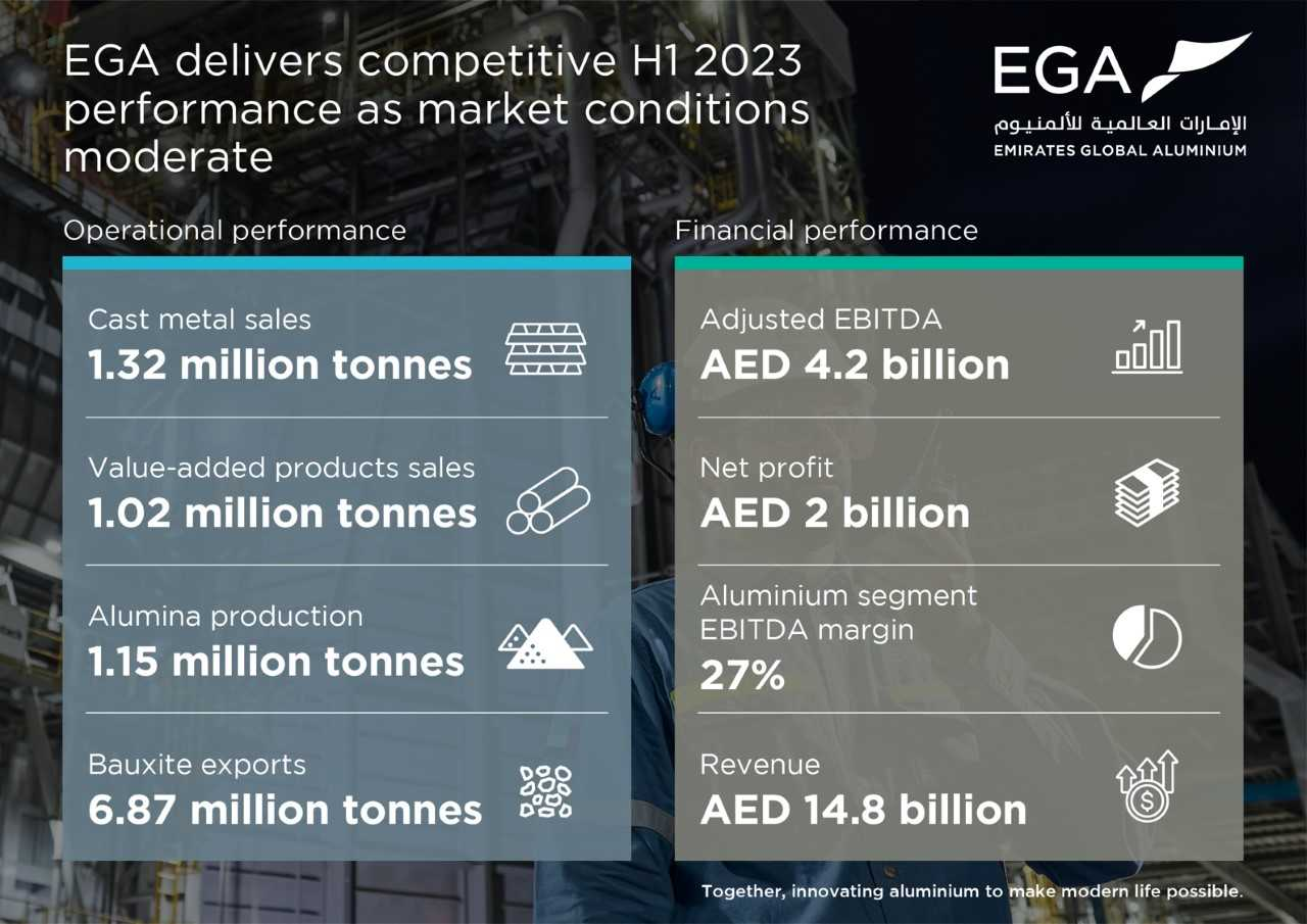 Emirates Global Aluminium (EGA) today reported competitive financial performance for the aluminium sector in the first half of 2023, announcing a net profit of AED2.0 billion ($533 million).