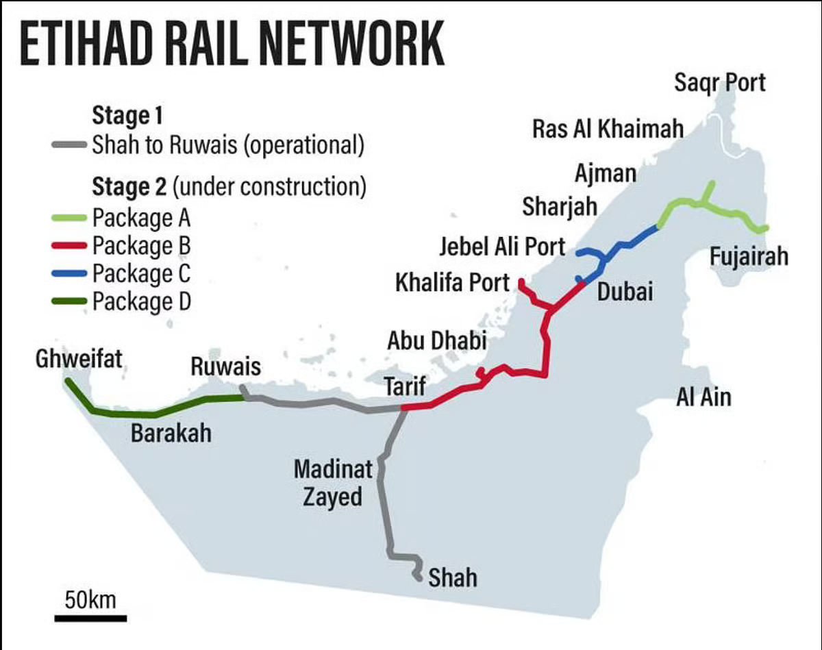 The Etihad Rail network will span approximately 900km, linking major cities and regions across all seven emirates and beyond. The cities connected include: