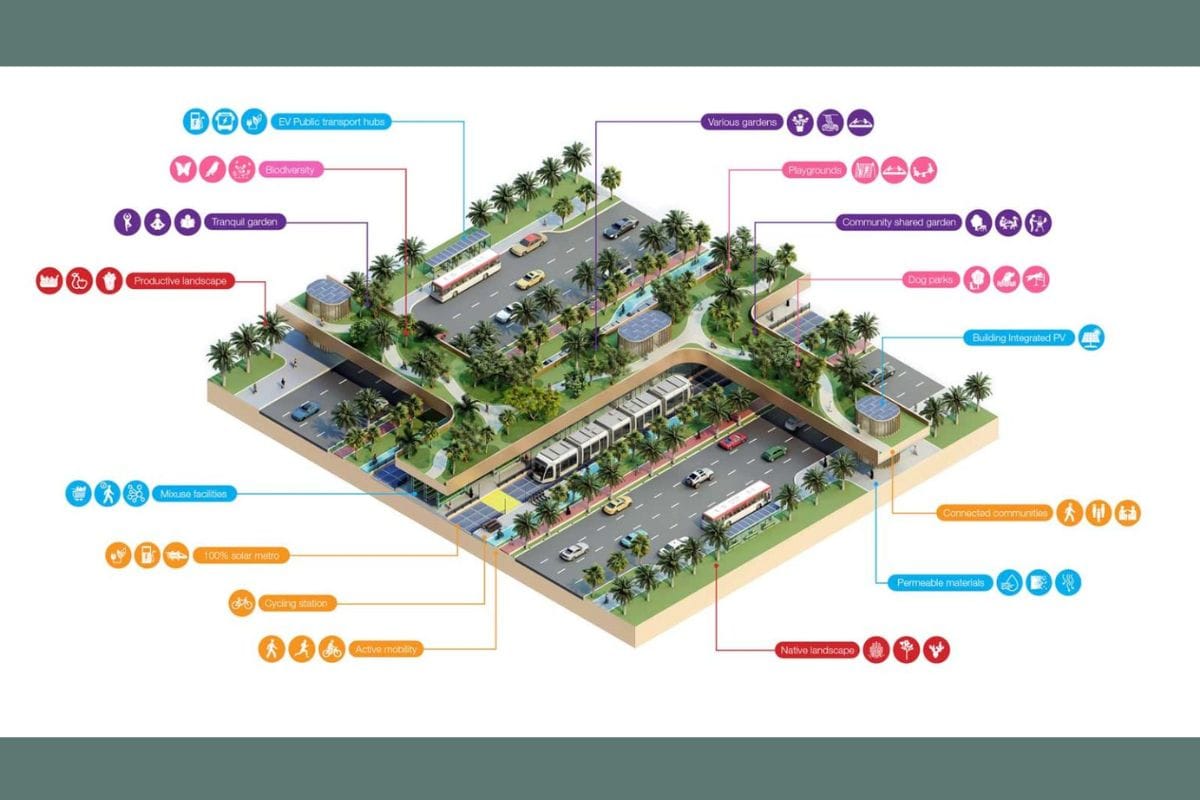 The Green Spine supports Dubai's 20-minute city vision, where essential services are accessible within a 20-minute walk or bike ride. It features cycling tracks, pedestrian pathways, and electric tram lines, reducing car dependence and enhancing urban mobility.