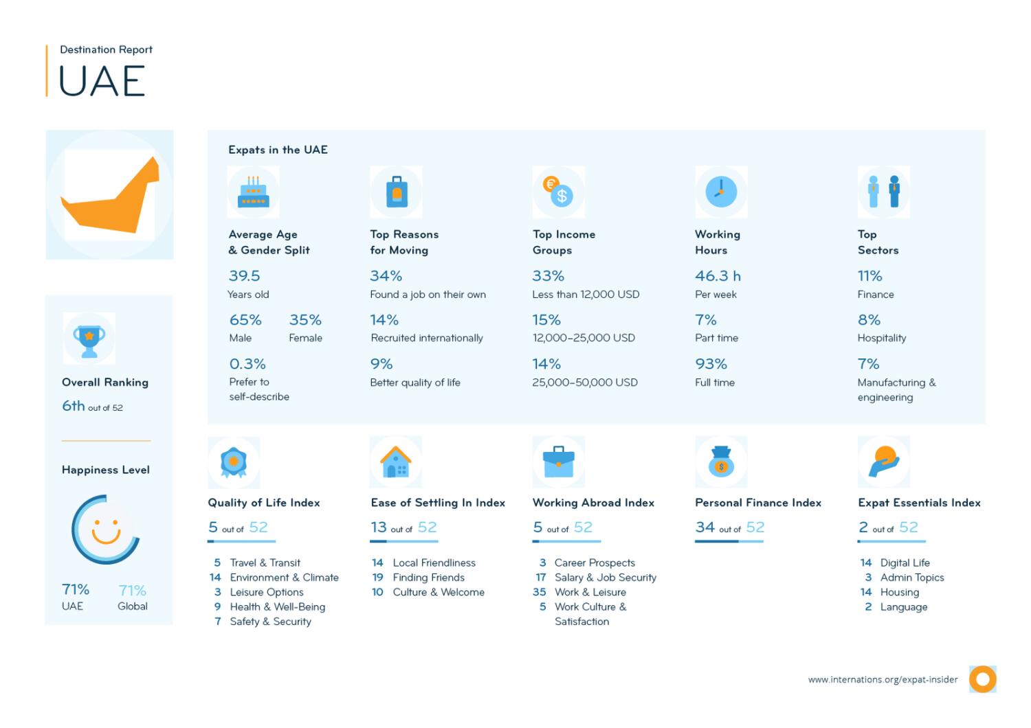 According to the 9th edition of the survey, UAE ranks 6th out of 52 countries while 71 per cent of expats are happy with their life in the UAE, the same as the global average.