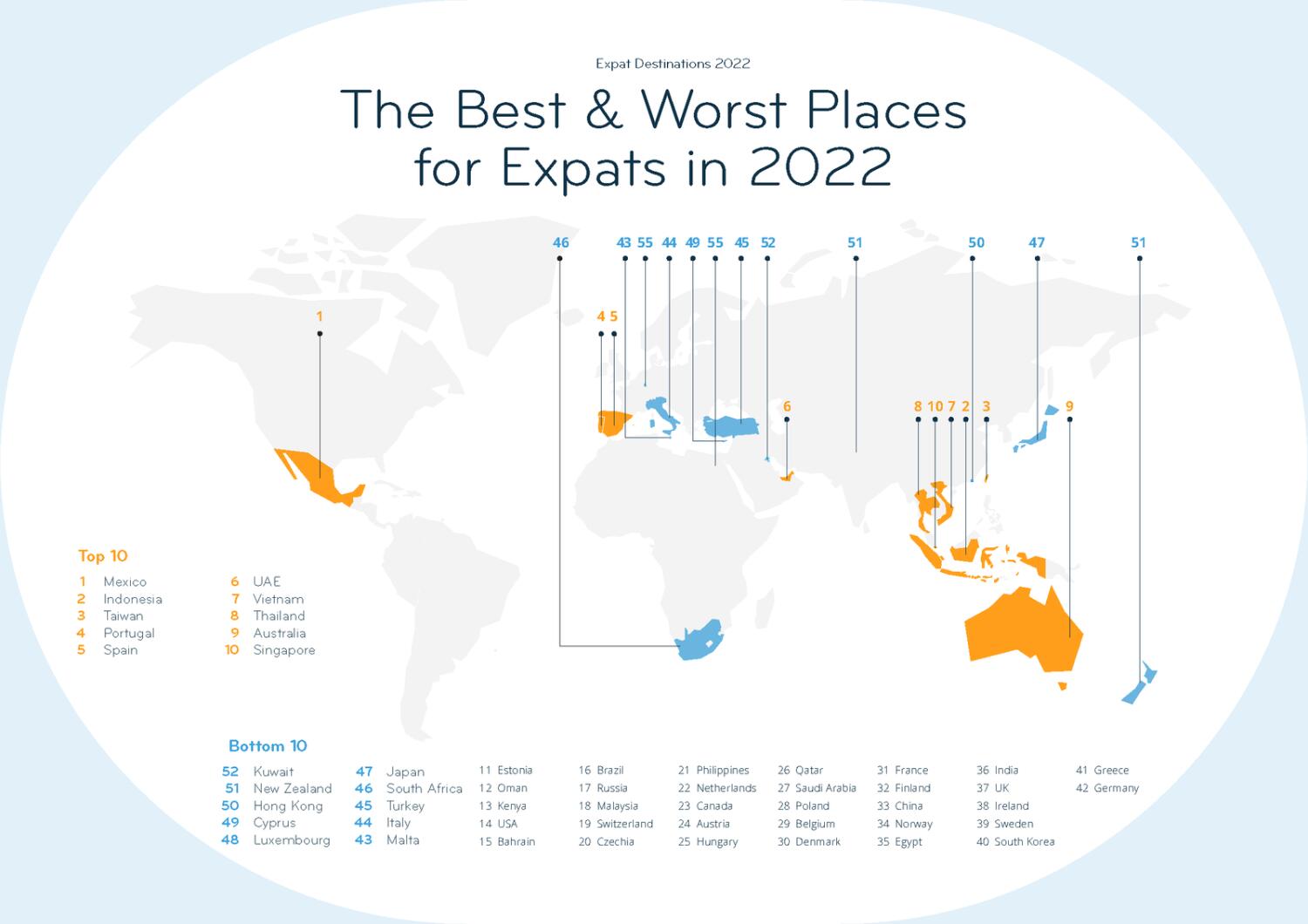 Globally, according to the Expat Insider 2022 survey results, Mexico, Indonesia, Taiwan, Portugal, Spain, the UAE, Vietnam, Thailand, Australia, and Singapore (10th) are the best destinations for expats.