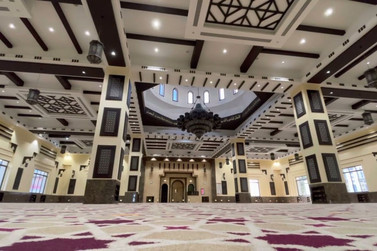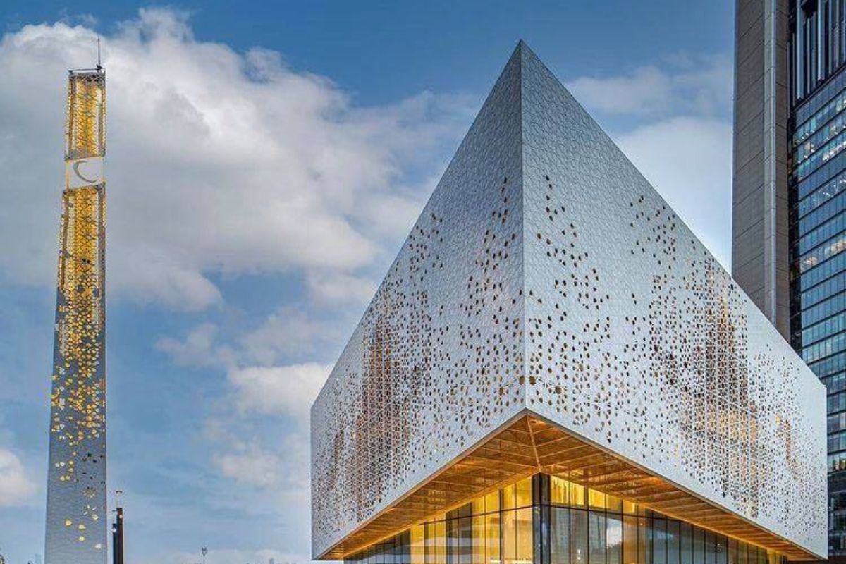 This contemporary mosque is a fusion of traditional Islamic architecture and contemporary design, and it is located at Gate Avenue in the Dubai International Financial Centre (DIFC). The mosque, which can accommodate 500 worshipers, pays homage to tradition with a hanging Mashrabiya, a perforated metal screen that filters light during the day and transforms the structure into an urban lantern at night. It combines modern and traditional design elements. It completes the row of buildings on Gate Avenue's promenade and has a gross floor area of 14,500 square feet. It is open 24 hours a day to serve all five daily prayer times, Friday prayers, and Ramadan prayers.