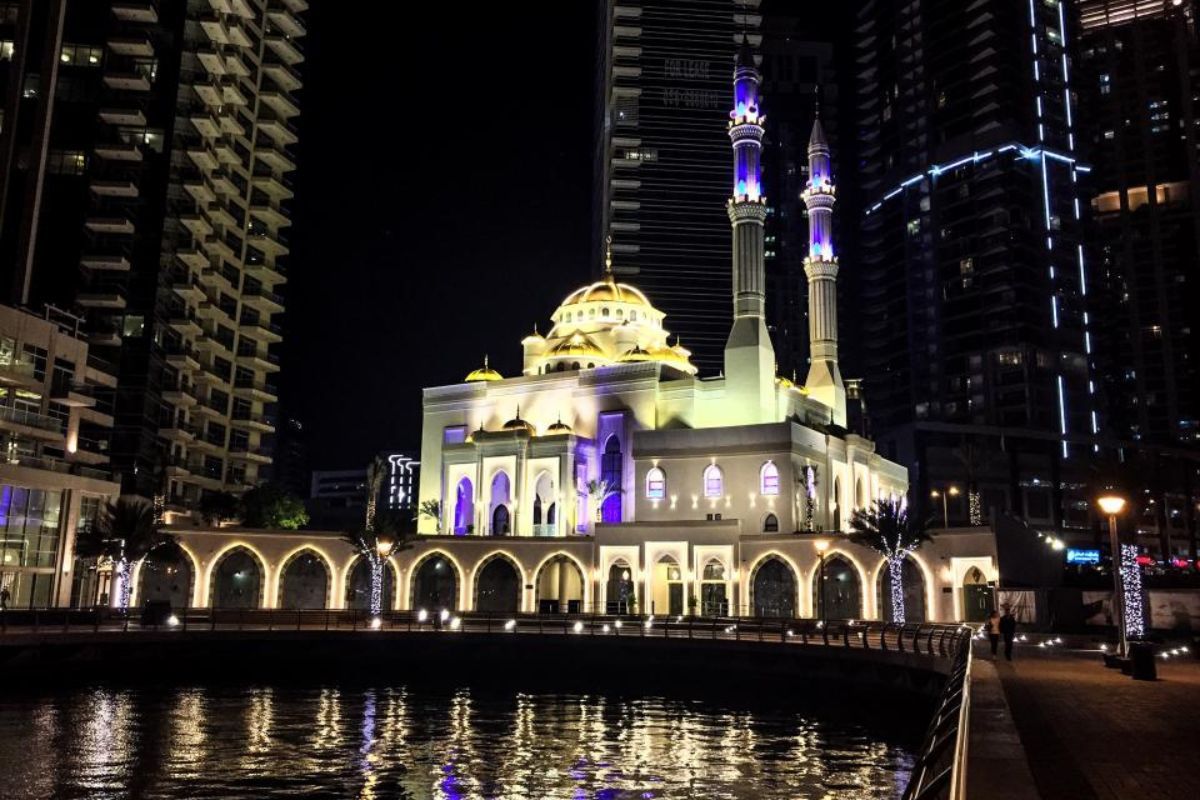 The Masjid Al Rahim is located on the banks of the Dubai Marina. This is Dubai Marina's only mosque, which opened in 2013. It has a capacity of 2,000 people. In the evenings, it is known to light up in blue and white, blending in with the façade of the Dubai Marina and its towering apartment buildings. The basic concepts of Islamic architecture are reflected in this masjid in Dubai. The mosque has a minaret and is crowned with a single dome. Aside from the minaret, from which the imam issues prayer calls, the mosque has a ziyada, which is a patio surrounded by a double wall, and a waterfall on the facade facing the marina. The mosque also houses a library and a Quran school, both dedicated to teaching Islamic studies.