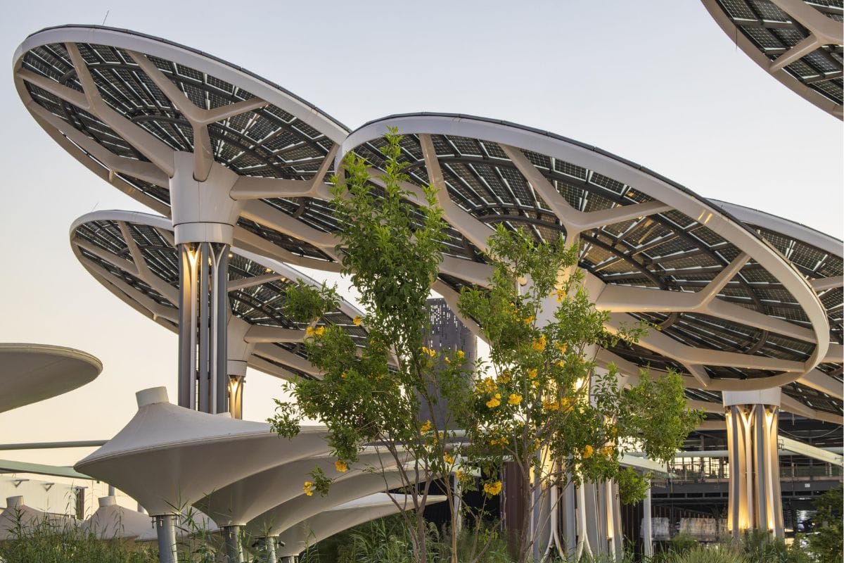 The pavilion’s standout feature is its canopy, inspired by the natural process of photosynthesis. Equipped with thousands of solar panels, this structure not only generates renewable energy but also provides shade, creating a welcoming environment for visitors. Surrounding the pavilion are solar “energy trees” that rotate to follow the sun, further amplifying its green credentials.