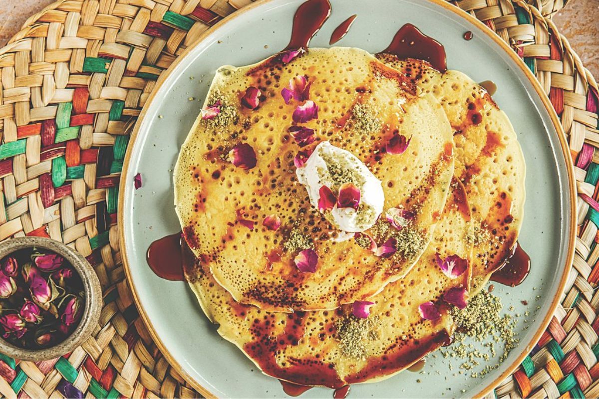 Chebab is an Arabic pancake-like sweet dish often consumed as breakfast in the region. This Emirati favorite pancakes are made with flour, yeast, milk, sugar, and eggs. The batter is often flavored with cardamom, turmeric, and saffron. It is served with butter, honey, sugar, jam, or date syrup. The batter mix holds high significance in the taste of chebab and therefore, each restaurant has its own guarded recipe of the dish.