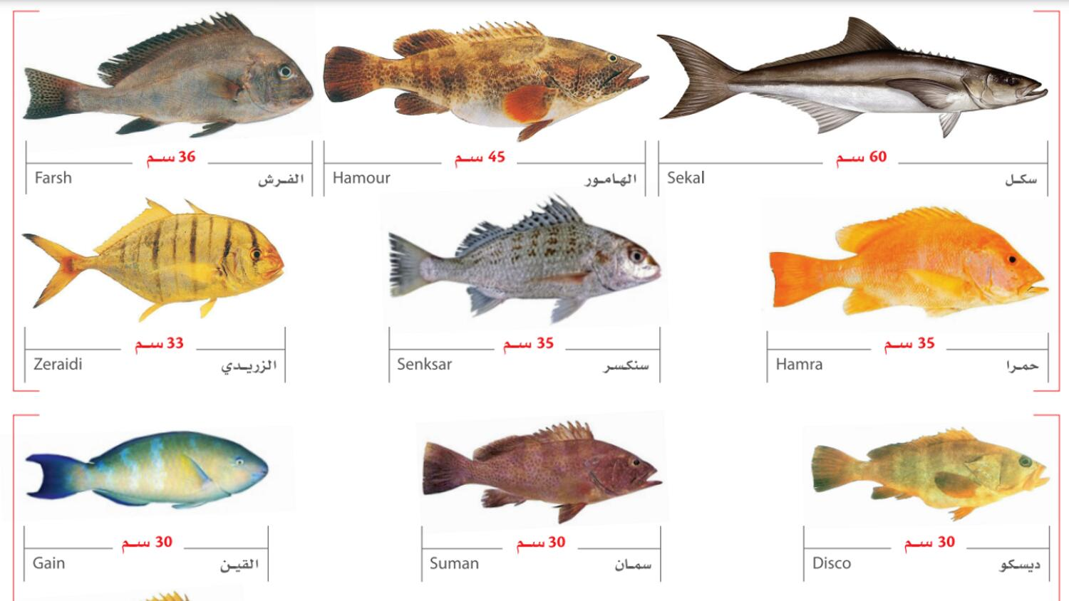| Catching, trading, selling or transporting small fish (as per laws regulating lengths of fish permitted to be caught). | Written warning and confiscation of small fish (This applies to fish shops, transporters and the hunter). | Dh1,000 fine and confiscation of fishes (This applies to fish shops, transporters and the hunter). | Boat licence seized from fisherman for a week. Fish shops closed for a week. Dh3,000 fine for the fish transport vehicle. |