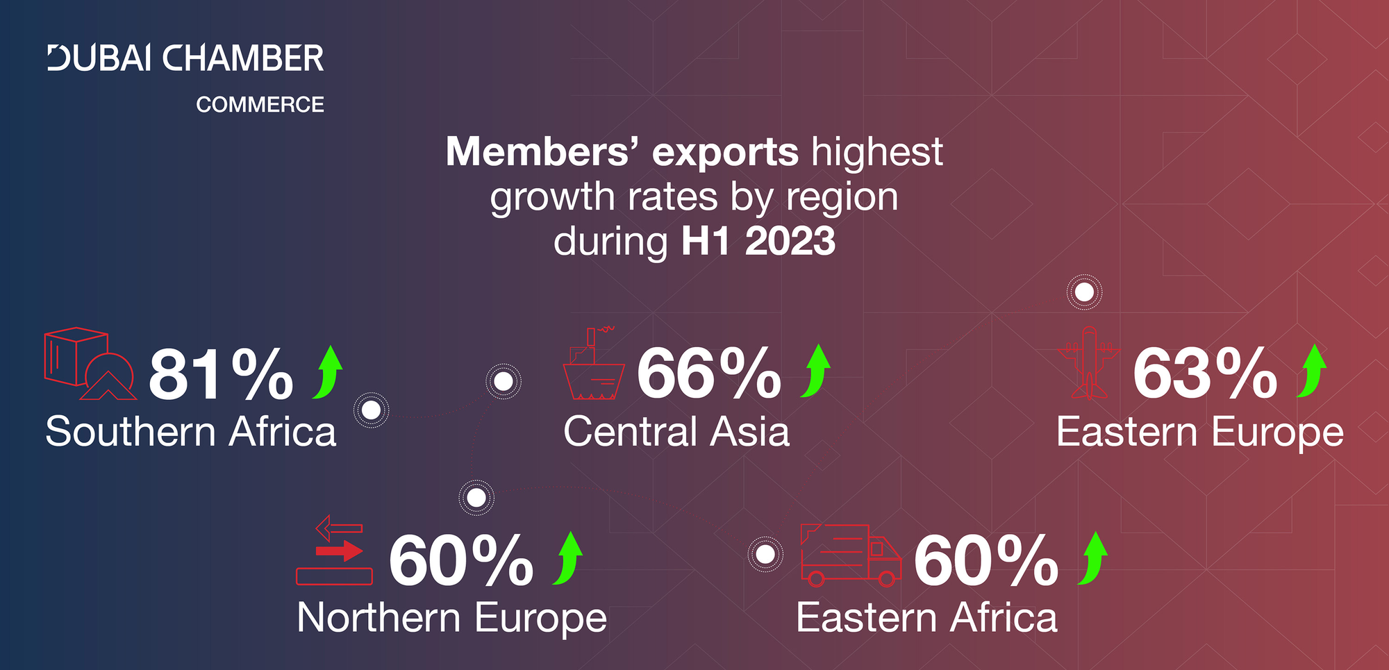 Northern Europe achieved a growth rate of 60% to reach AED 517.4 million, up from AED 323.6 million during H1 2022. East Africa recorded the fifth-highest increase, with the value of its members' exports and re-exports achieving year-over-year growth of 60% to reach AED 4.9 billion in H1 2023, up from AED 3.1 billion during the first six months of 2022.