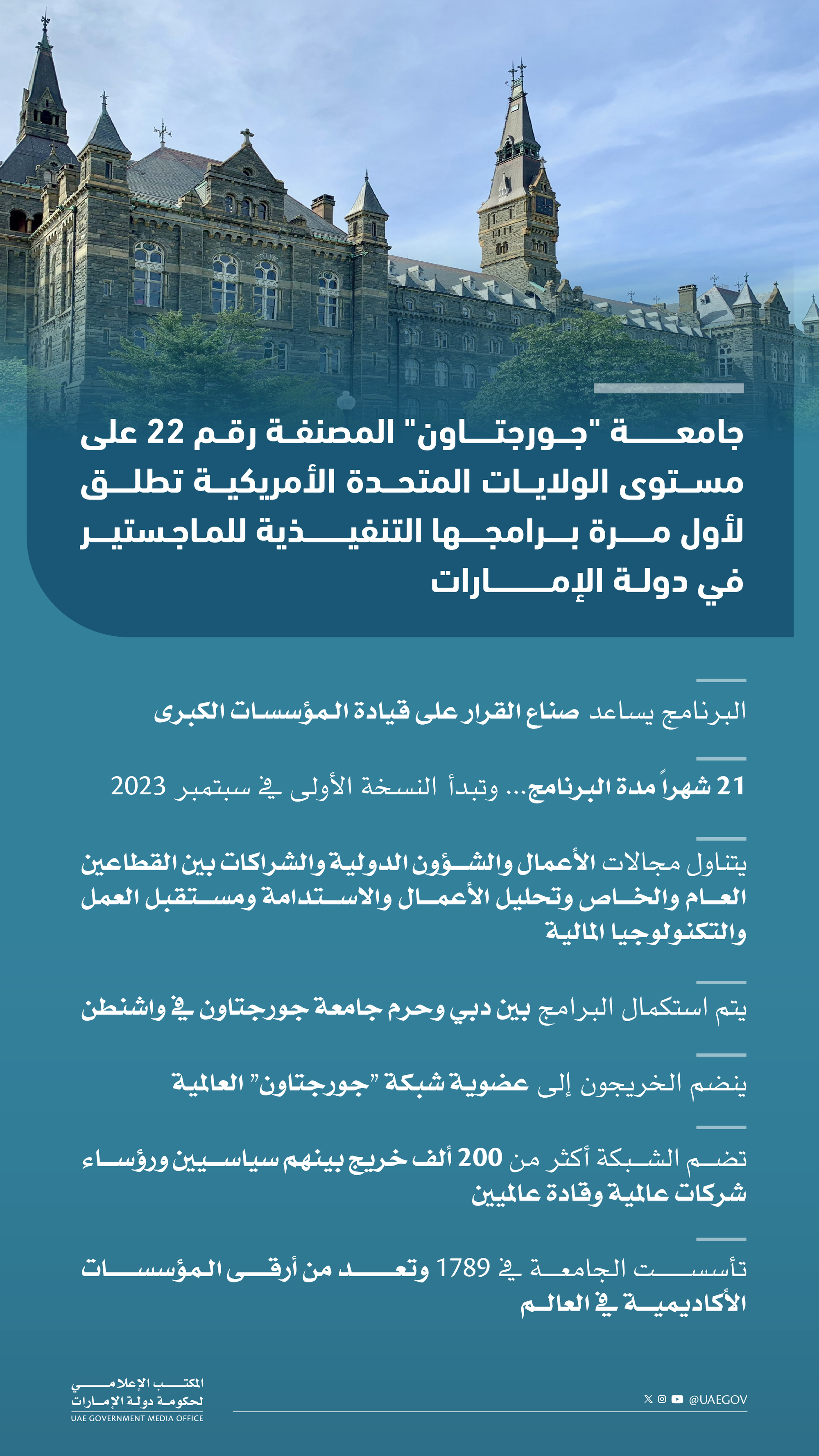 "Georgetown University has educated generations of world leaders since it was founded in 1789. Our continued focus on a rigorous academic experience, underpinned by a commitment to values and service to others, has prepared our graduates to take on the world's most challenging issues and make a true difference in the world. We are excited to establish our Executive MBA programme in the UAE, equipping graduates to help elevate the region at a time of great innovation."