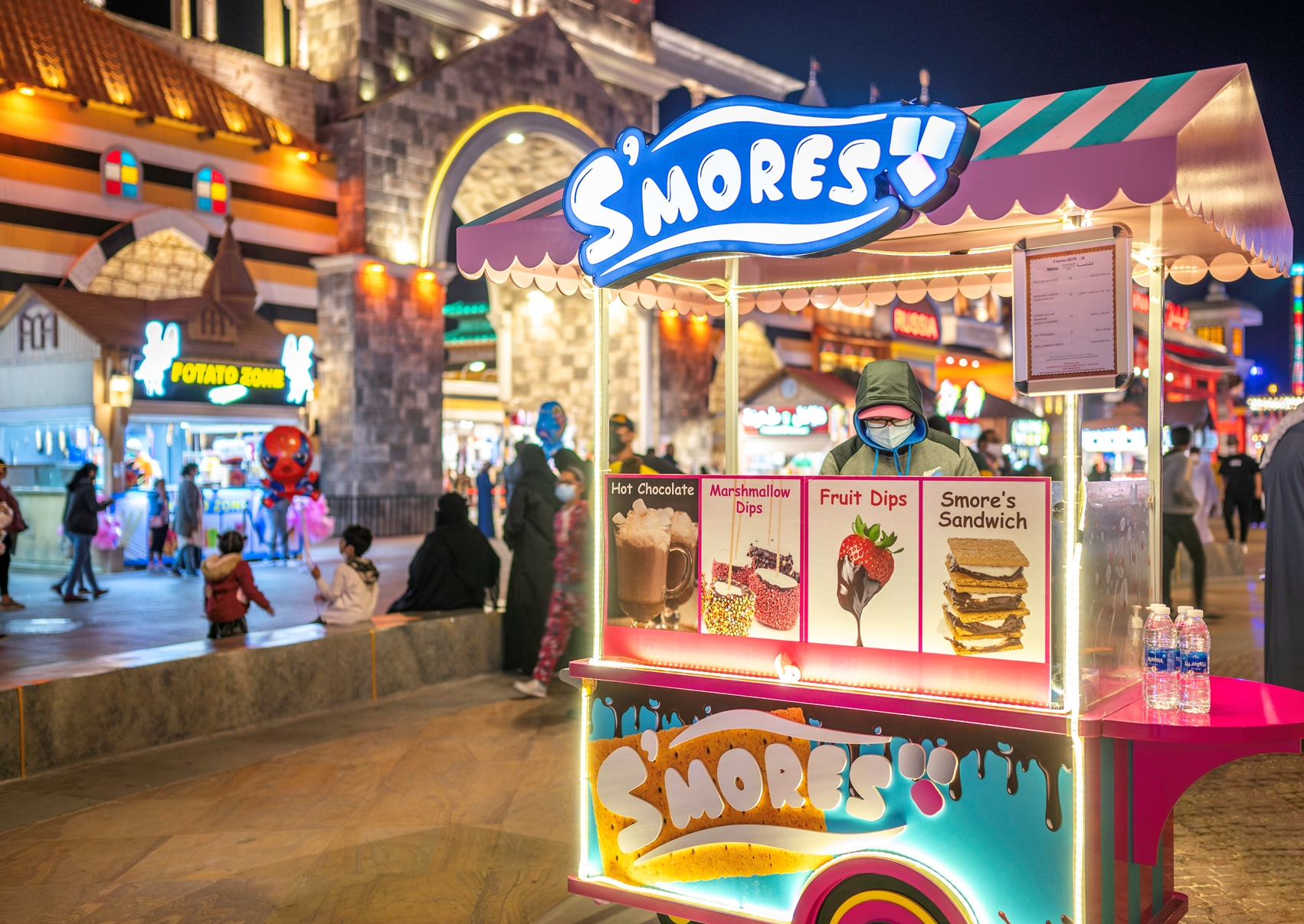 The Fiesta Street at Global Village is adorned with many food stalls. A vibrant street food festival is happening on this street of Global Village where you can indulge in a wide range of mouthwatering treats. From the stalls, you can taste popular street foods with modern twists like baklava frappes, loaded fries, creamy risottos, and toasted chicken sandwiches. Colorful flavored crushers and ice pops are the kid favorites at Global Village Dubai.