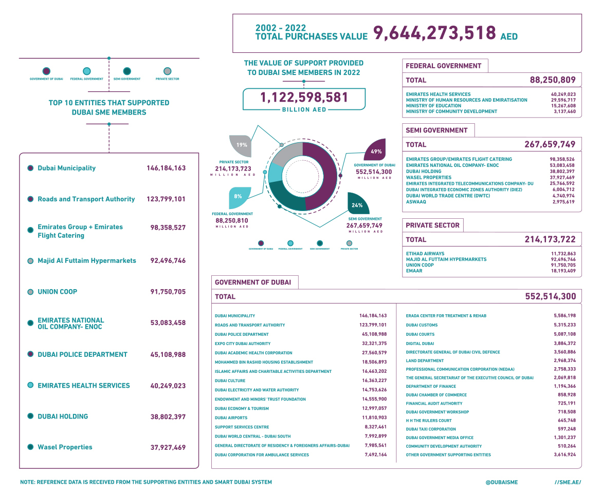 Dubai Government entities supporting SMEs include Dubai Municipality, the Roads and Transport Authority and Dubai Police. Federal government entities at the forefront of supporting SMEs include Emirates Health Services and the Ministry of Human Resources and Emiratisation.