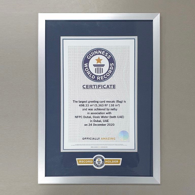 An outstanding piece of UAE flag made with mosaic, and measuring 498.33 m², has been added to the Guinness World Records under "Nefsy’s" initiative during the 49th UAE National Day last year.