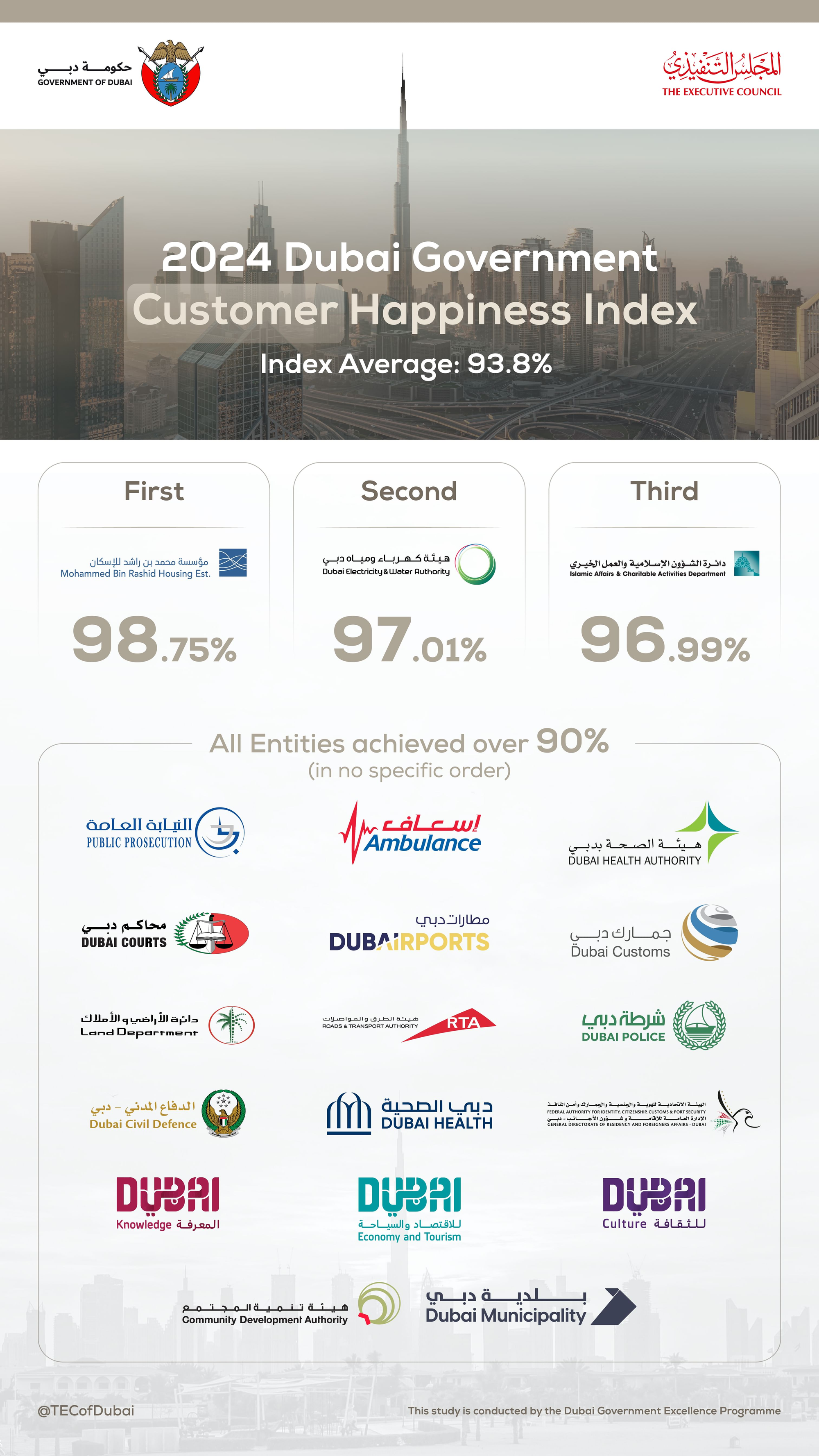 The Mohammed Bin Rashid Housing Establishment ranked first in both customer and employee happiness, with scores of 98.75% and 96.7%, respectively.