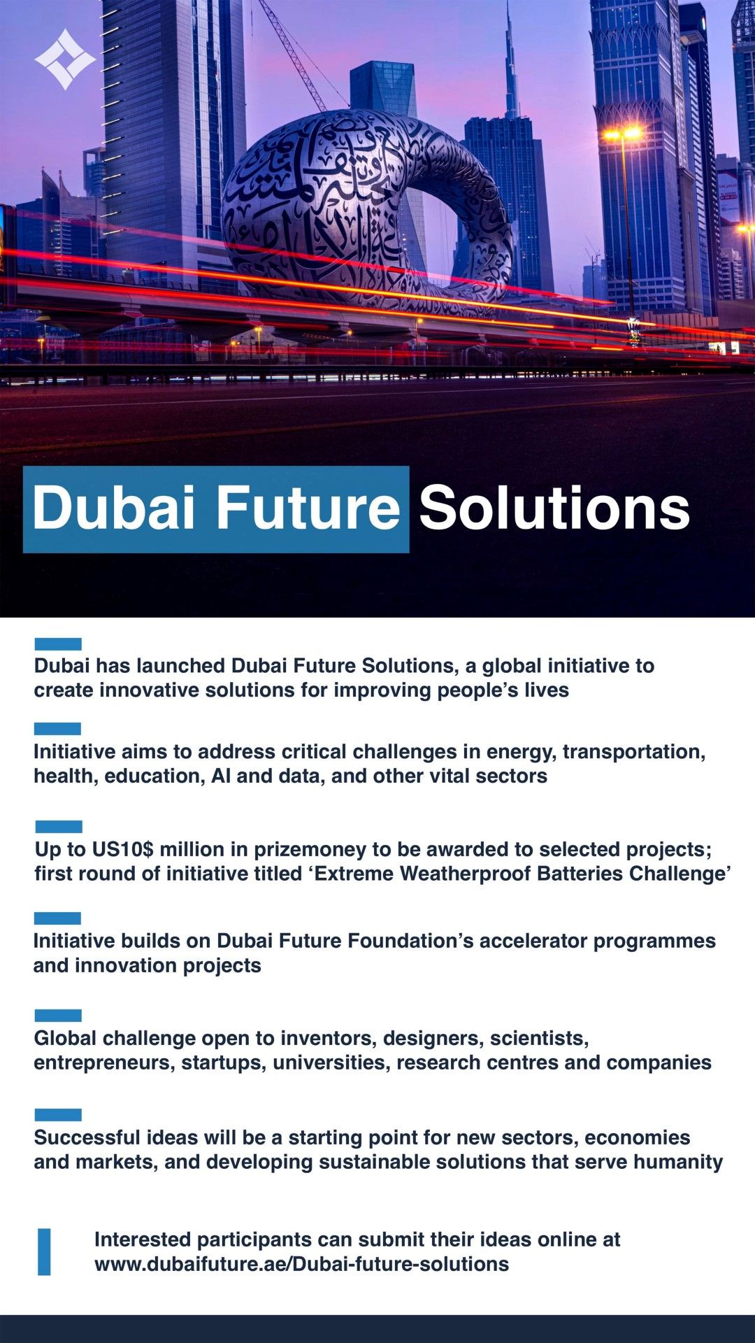 H.H. Sheikh Hamdan bin Mohammed bin Rashid Al Maktoum launched Dubai Future Solutions, a global initiative featuring a series of challenges that will bring together scientists, designers, inventors, universities, research centres, companies and start-ups from around the world to create innovative solutions for improving people’s lives.