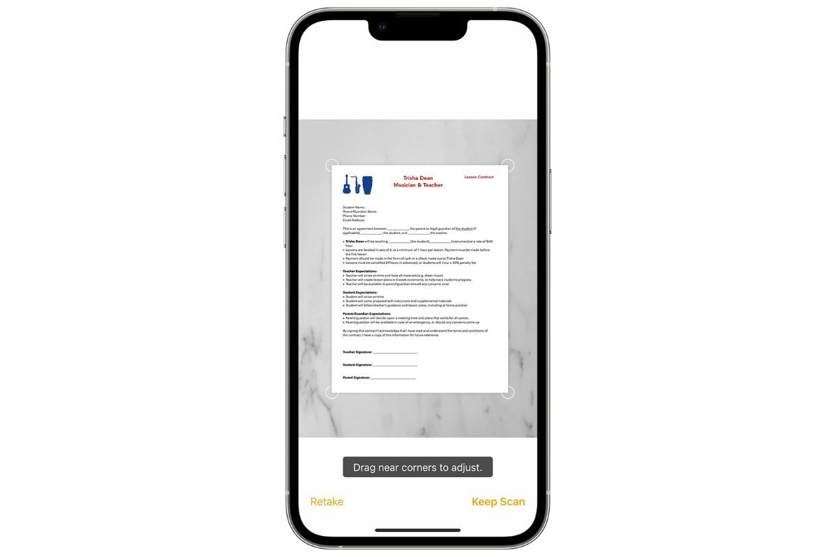 You can easily scan a document without the help of a third-party app if you have an iPhone. Open the Notes app on your phone, tap the Camera icon, then tap Scan Documents. You can then properly align your document and click on the shutter button to click. Finish the scan by dragging the corners to adjust the scan and then tap on Keep Scan.