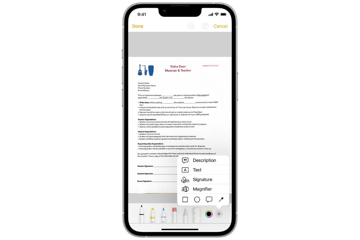 You can also sign a document without having to download a third-party app. Open the Notes app and open the document you want to sign. You need to tap on the Share button and then the markup icon. Click on the add icon which will result in a pop-up from which you can tap on Signature. You can then add a saved signature or create a new one. Then adjust the size of the signature box and place it in the desired space and click on Done.