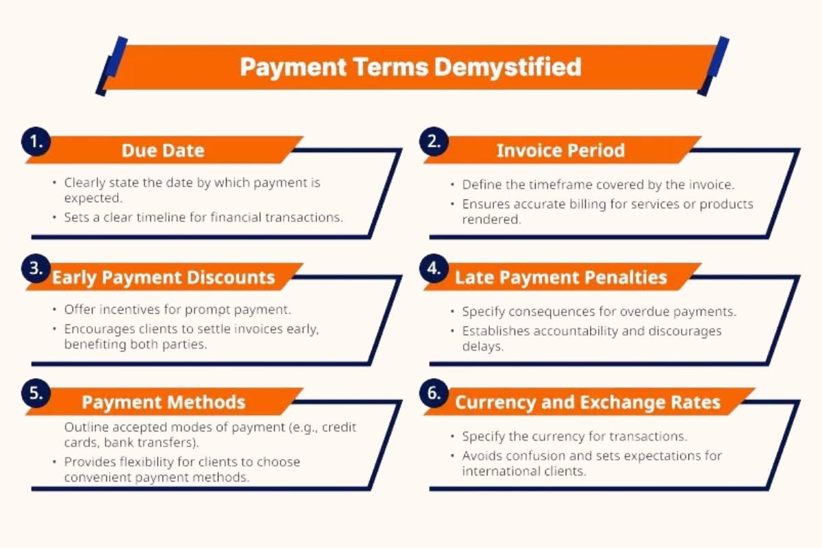 Specific payment terms: State exactly when payment is due. "Net 30" means 30 days from invoice date. "Net 30 from delivery" provides even more clarity.