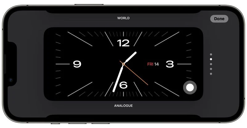 StandBy's third screen presents the time and date in a variety of themes that can be scrolled through vertically. Certain themes also display additional information, such as the temperature or your upcoming alarm. If you press and hold on a clock, you can switch between different themes, including Digital, Analogue, World, Solar, and Float.