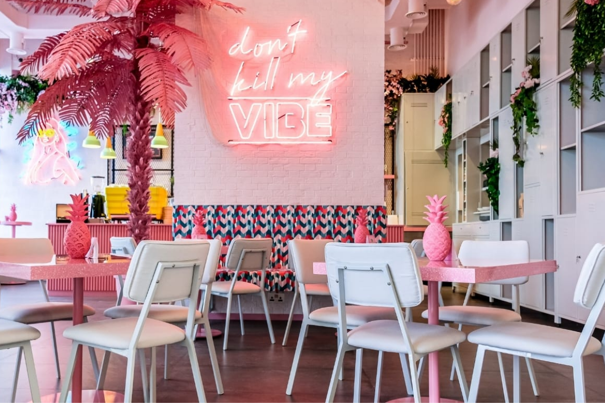 Filling your feed with aesthetic food content is easy when you’re visiting The Vibe Café. You'll be guaranteed a smile as soon as you enter this brightly colored, tropical-style cafe, which will transport you to a small Caribbean roadside stop, with the promise of "only positive vibes." We have to give them credit for names like "I'm benedicated to you," "Don't go Bacon my heart," and others because their brunch dishes are works of art. Their slim thicc pizza with its ruby colored base thanks to its beetroot and cauliflower base, or their healthy and gorgeous looking eggs benedict served on pink fluffy muffins and drizzled with pink sauce will make it difficult for you to resist not taking a picture before eating. Each table has pineapple ornaments in the color bubblegum, and there are palm trees and other vegetation lining the windows, along with neon signs that illuminate the room.