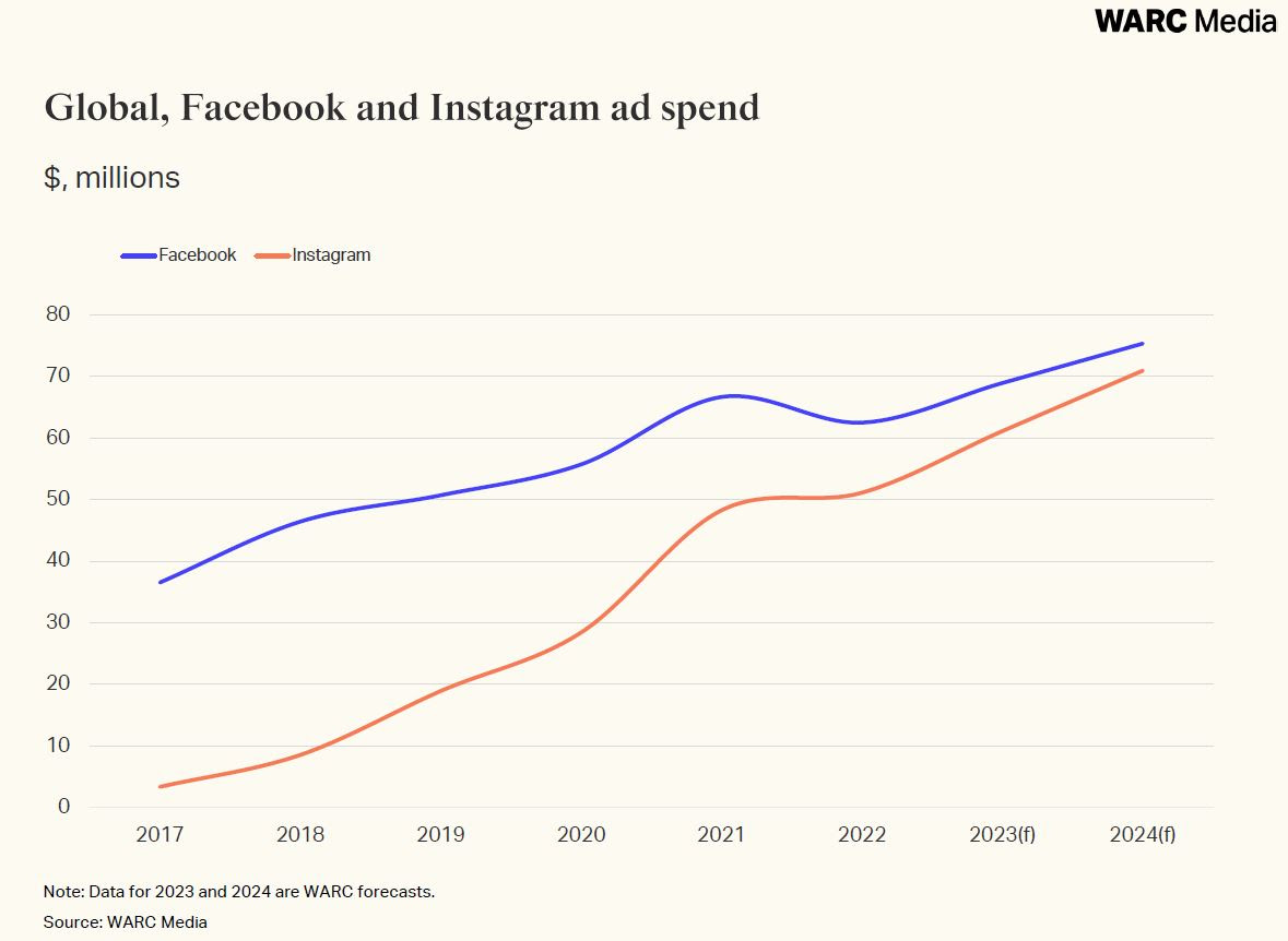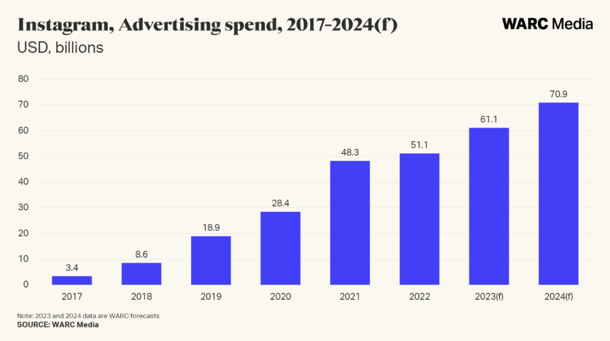 WARC Media forecasts Instagram’s advertising revenue to reach $71bn in 2024, driven by parent company Meta’s innovation with AI to assist content recommendation and advertising automation processes, as well as improved monetization of Reels, its short-form video product.