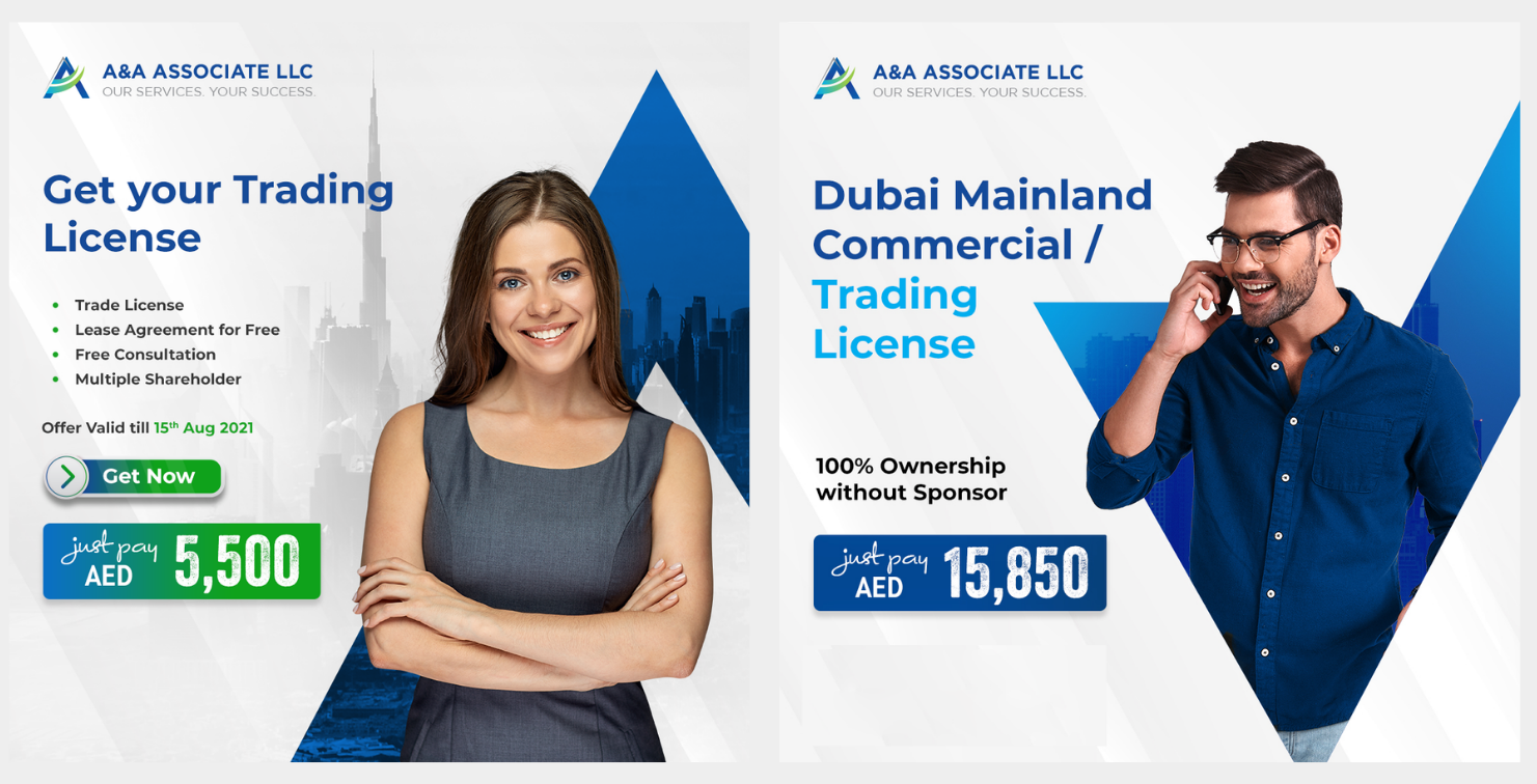 Business License with Residence Visa - AED 14,500, E-Commerce License - AED 5,500, Dubai Mainland Trading License - AED 15,850