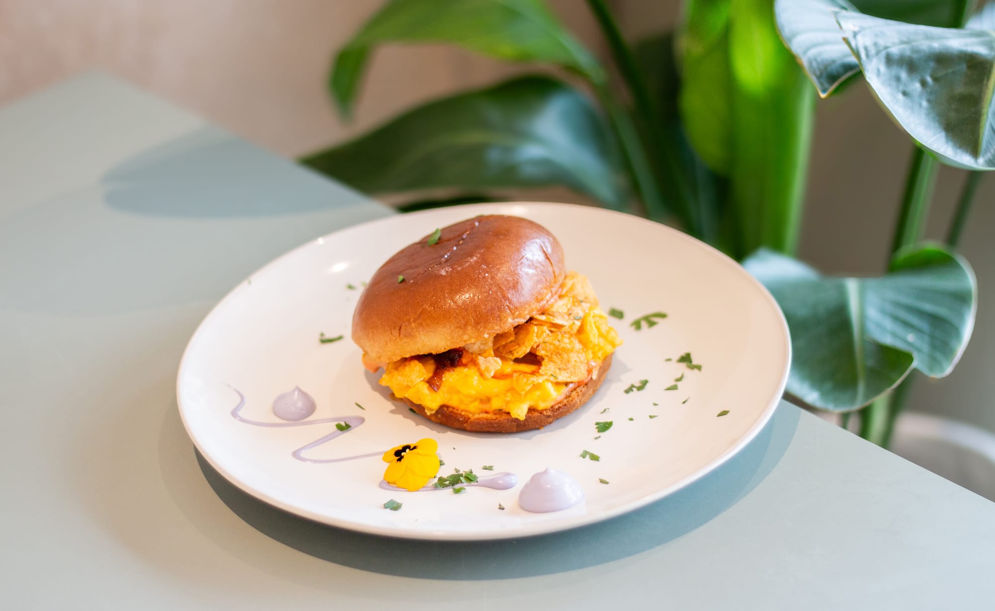 If I'm picking by category, I'd say in our breakfast, our egg bun has been super popular. It's one of my personal favorites. It can be made with gluten-free bread as well. It has scrambled eggs, melted cheese, and sriracha sauce, and is sprinkled with Chips Oman on top, which is really nice. Our Eggs Benedict and Eggs Royale are also very popular; we dye our bread using tea leaves, and they're just very wholesome and nutritious. Surprisingly, our burgers have been really popular. We make the bread and patty in-house, and it's just very fresh and good to eat. For desserts, I would highly recommend our Tiramishroom, which is basically tiramisu shaped like mushrooms. I love mushrooms.