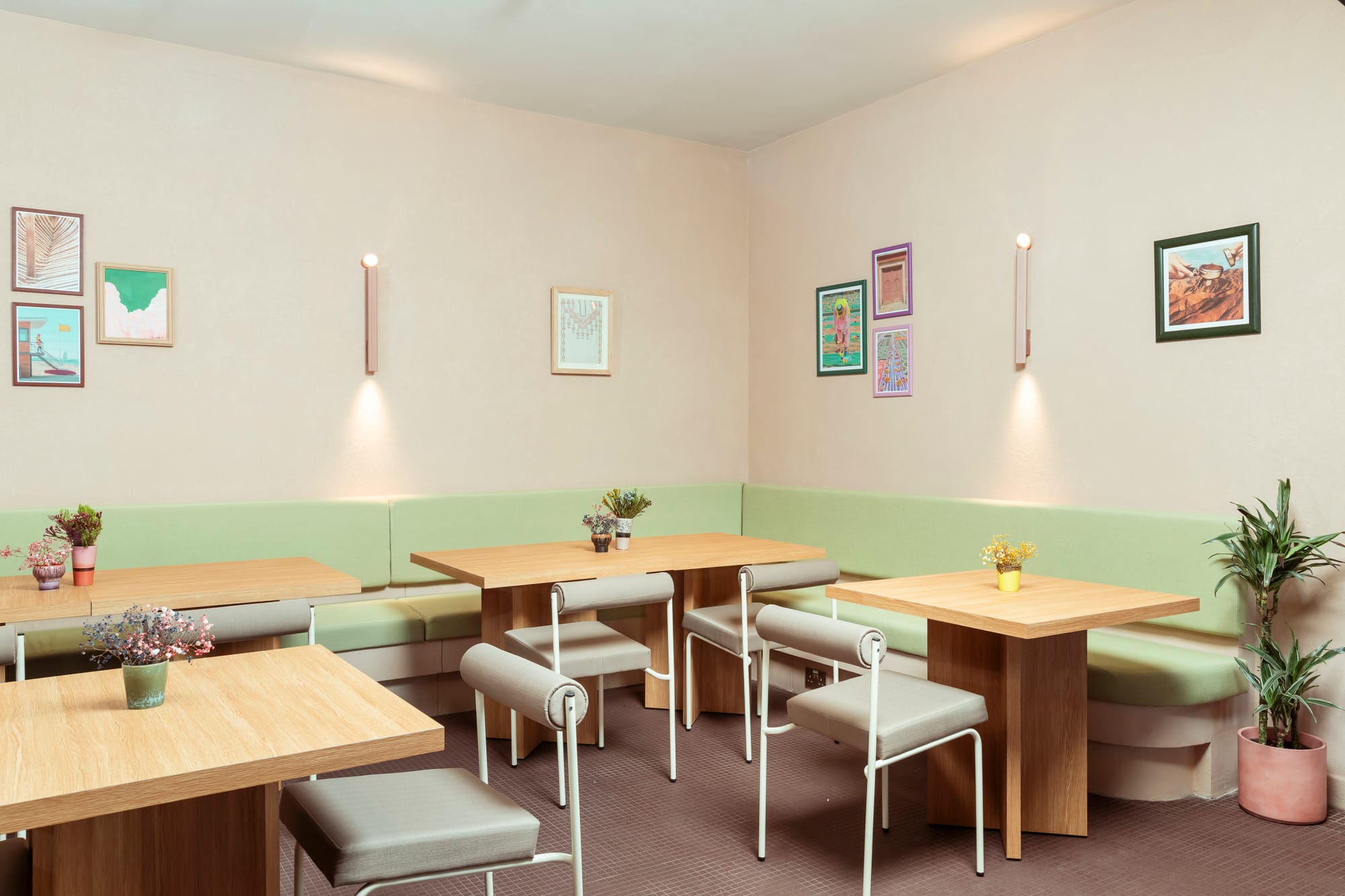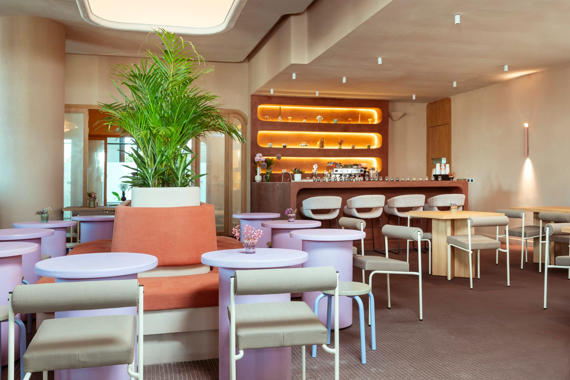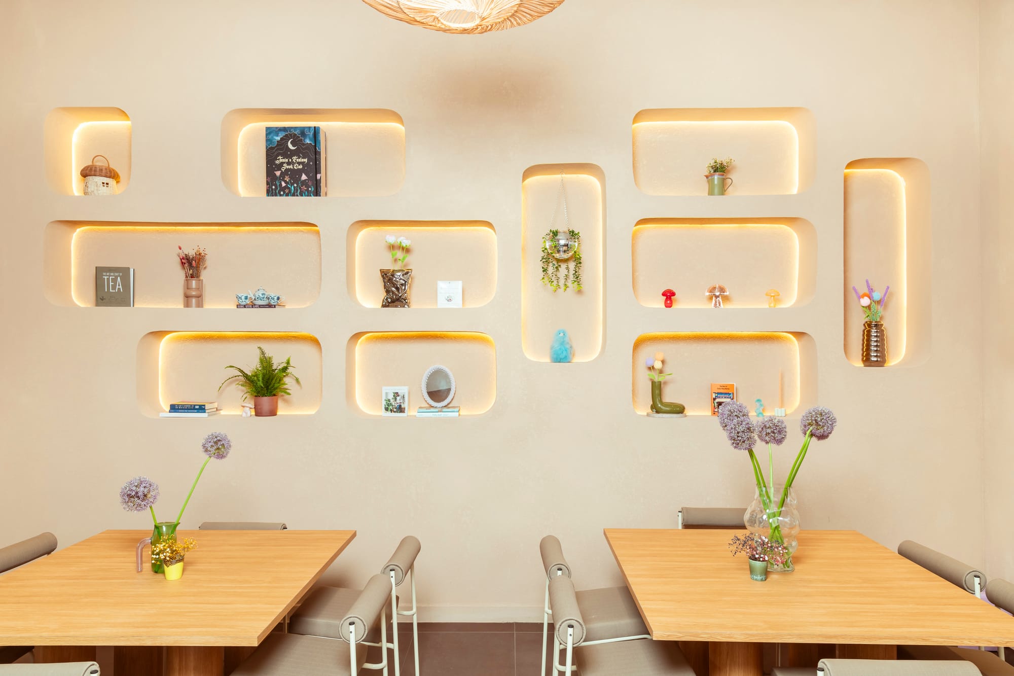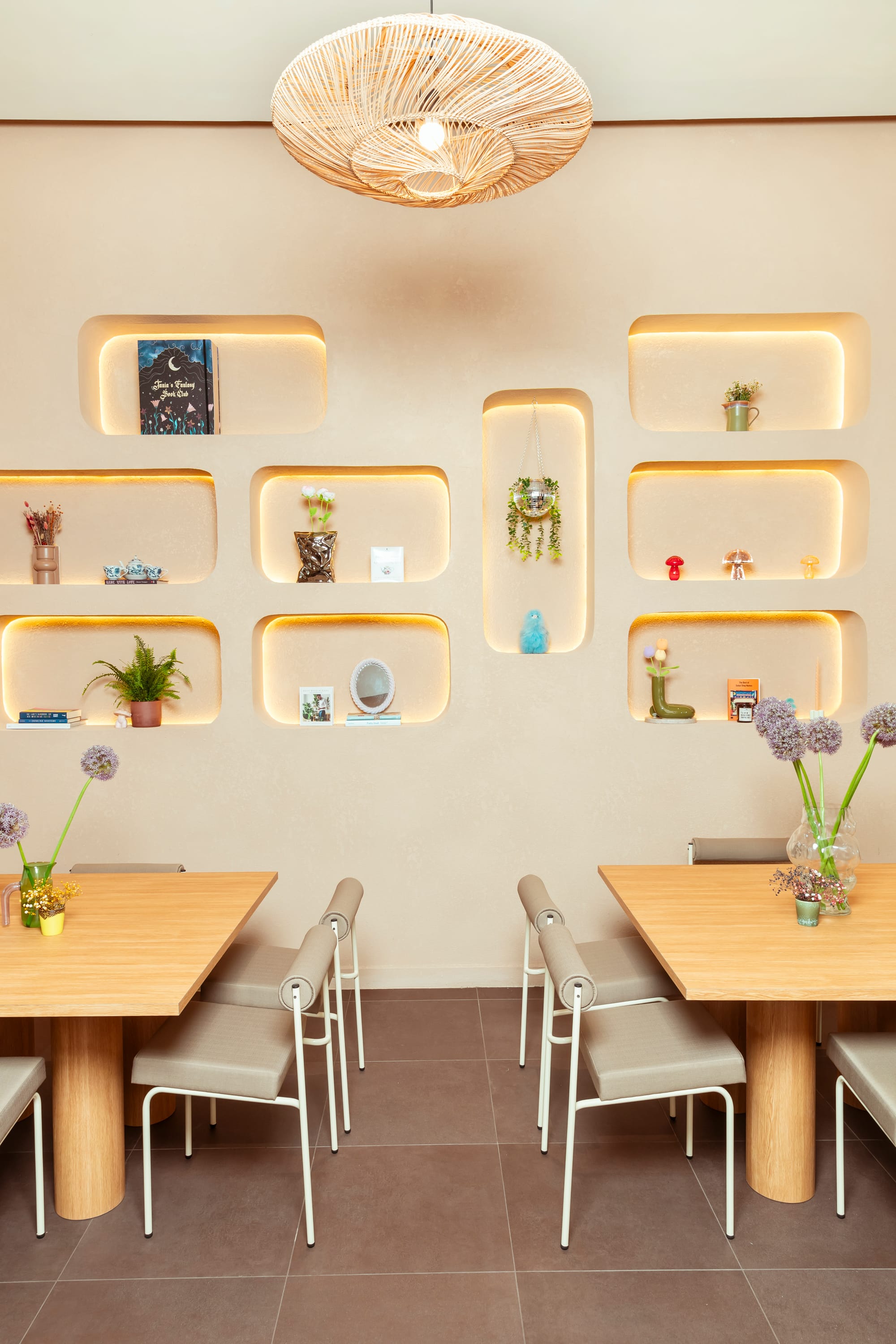 I wanted to create something that felt comfortable and cozy, but also a bit more eclectic and classy than our old branch. As I mentioned, I opened our old branch about five years ago. My taste has changed, I've grown up, and the brand has evolved and grown up as well. I wanted to create a place that felt comforting but also aesthetically pleasing. We use different elements of Scandinavian design, pops of pastels while staying a bit neutral, and incorporate a lot of cozy ceramics and more eclectic elements.