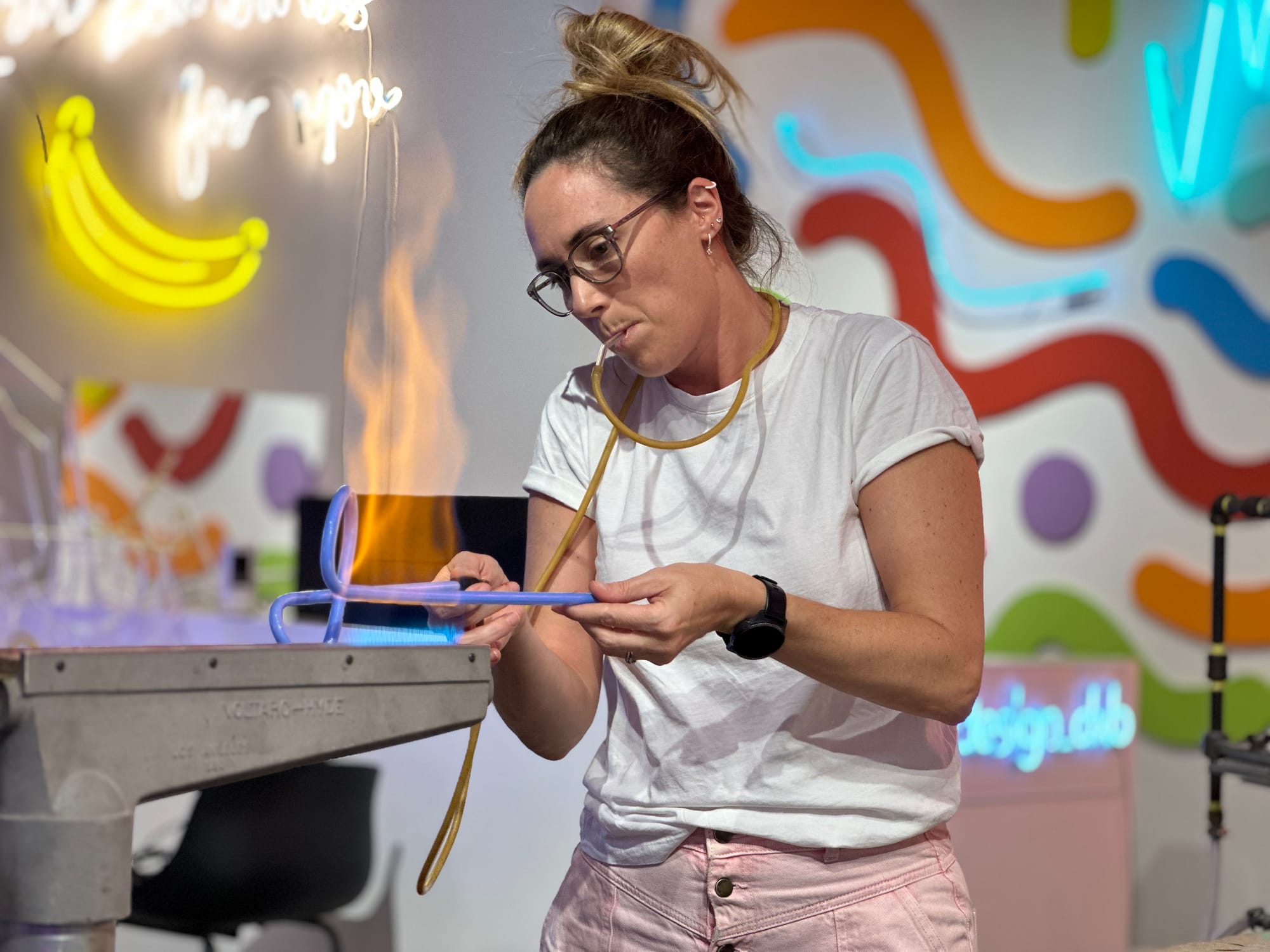 Charlotte hosts a Neon Discovery workshop to provide hands-on experience. The workshop offers a private and flexible experience lasting an hour and a half. Participants can book sessions in the morning, afternoon, or night through the website and then coordinate a suitable date. This workshop is designed to provide an in-depth understanding of the art of neon light. Participants delve into the medium's history, and its intricate processes, and even get hands-on experience bending glass in the fiery workshop environment.