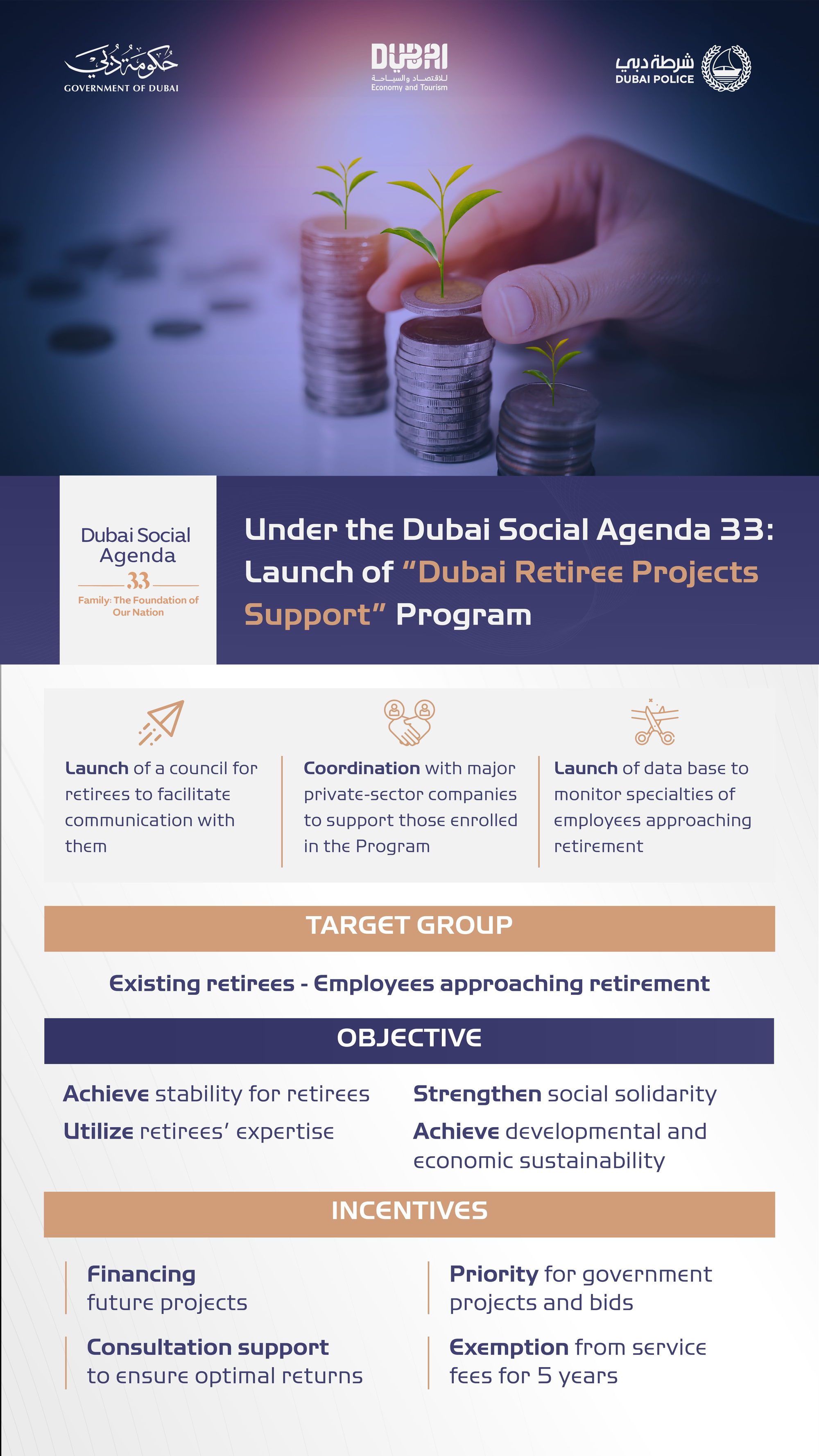 Under the visionary Dubai Social Agenda 33, Dubai SME launched Retiree Projects Support programme to empower Emirati retirees and employees nearing retirement to thrive in entrepreneurship. Aimed at harnessing their expertise, the initiative offers priority access to government projects, financing, and a five-year exemption from service fees through Dubai SME. Retirees are also provided with consultations and a supportive council to ensure financial and social stability.