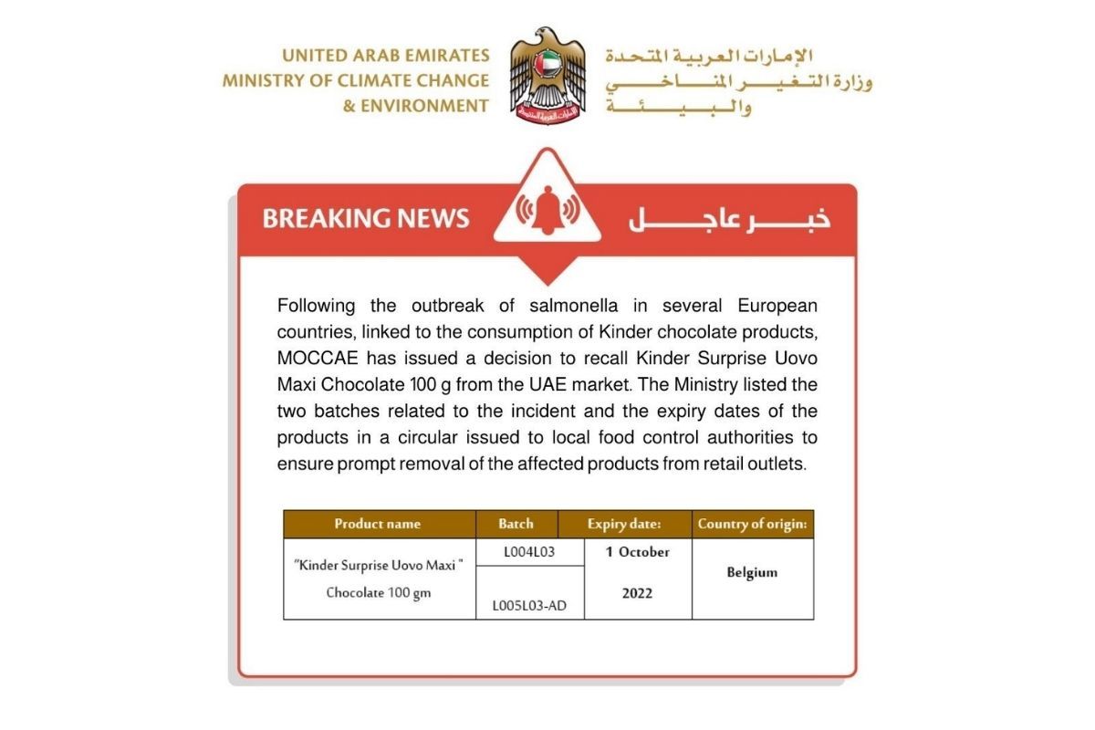 The National Rapid Alert System for Food revealed that out of the wide range of Kinder products manufactured in eight factories and sold in the UAE, only two batches of Kinder Surprise Uovo Maxi Chocolate 100 gm sourced from one factory in Belgium are affected. However, the Ministry will enforce tighter control measures on other products from Ferrero, the manufacturer of Kinder, that are traded in the UAE. The System is run by MOCCAE in coordination with local food safety entities, including Abu Dhabi Agriculture and Food Safety Authority (ADAFSA) and municipal authorities in Dubai, Sharjah, Ajman, Umm Al Quwain, Ras Al Khaimah, and Fujairah.