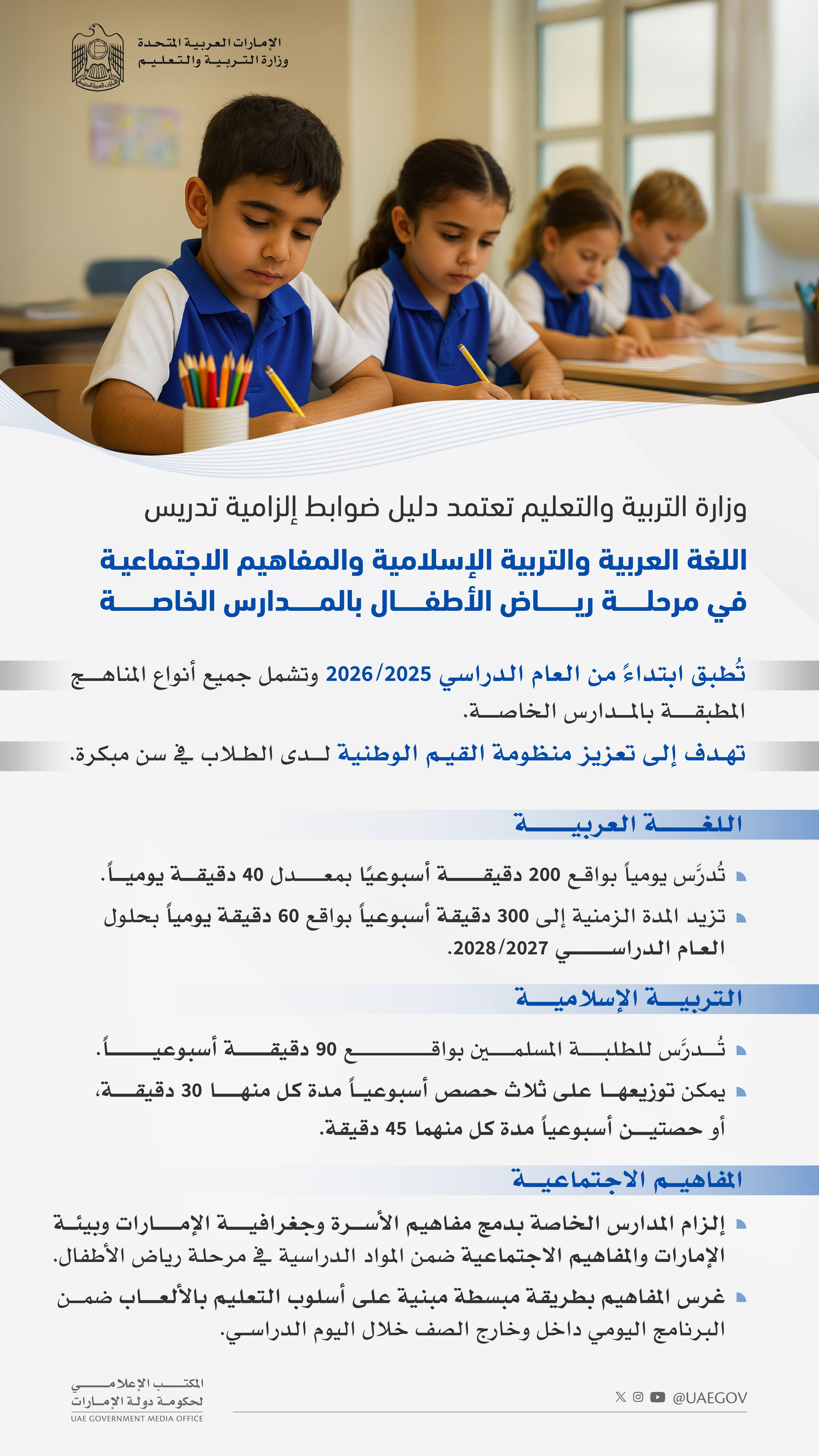The UAE Ministry of Education has made it mandatory for all private schools to teach Arabic, Islamic Studies, and Social Studies at the kindergarten level starting from the 2025/2026 academic year.