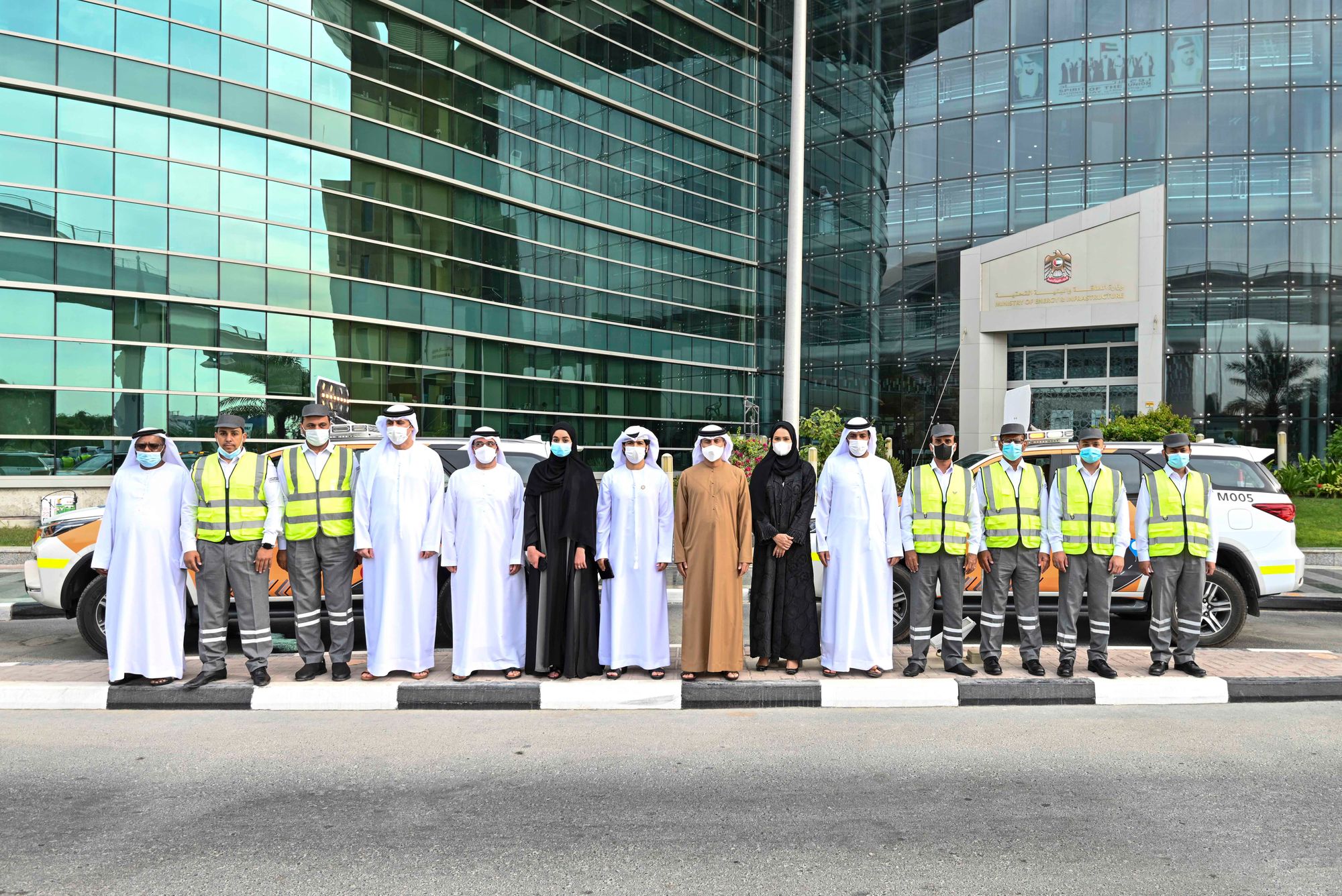Abdul Rahman Al Mahmoud, Director of the Federal Roads Assets Department, Khamis Al Shehiari, Head of the Roads Development and Traffic Safety Department, Sogha Al Samahi and Habiba Aflatoun, briefed Al Mazrouei about the cars, which will help advance the UAE's road system and ensure traffic safety.