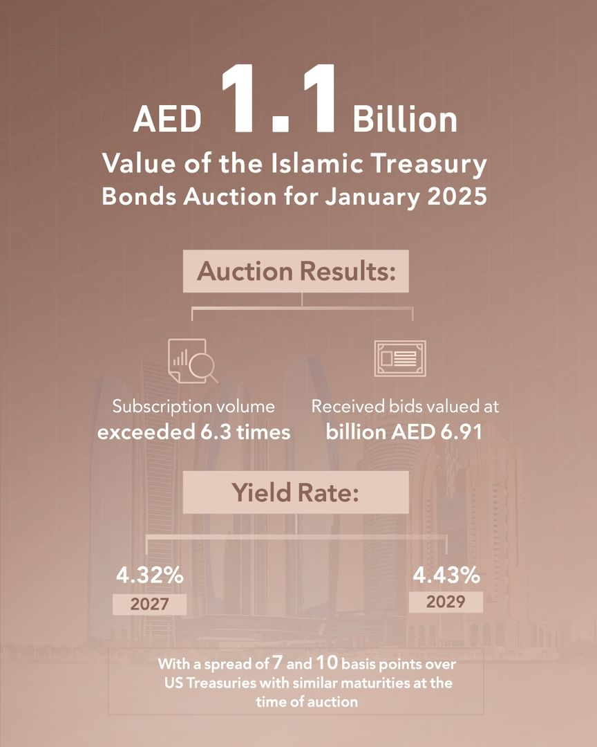The auction drew robust interest from the eight primary dealers, with bids totaling AED6.91 billion, representing an oversubscription rate of 6.3 times. The T-Sukuk, denominated in UAE dirhams, includes two tranches maturing in May 2027 and September 2029.