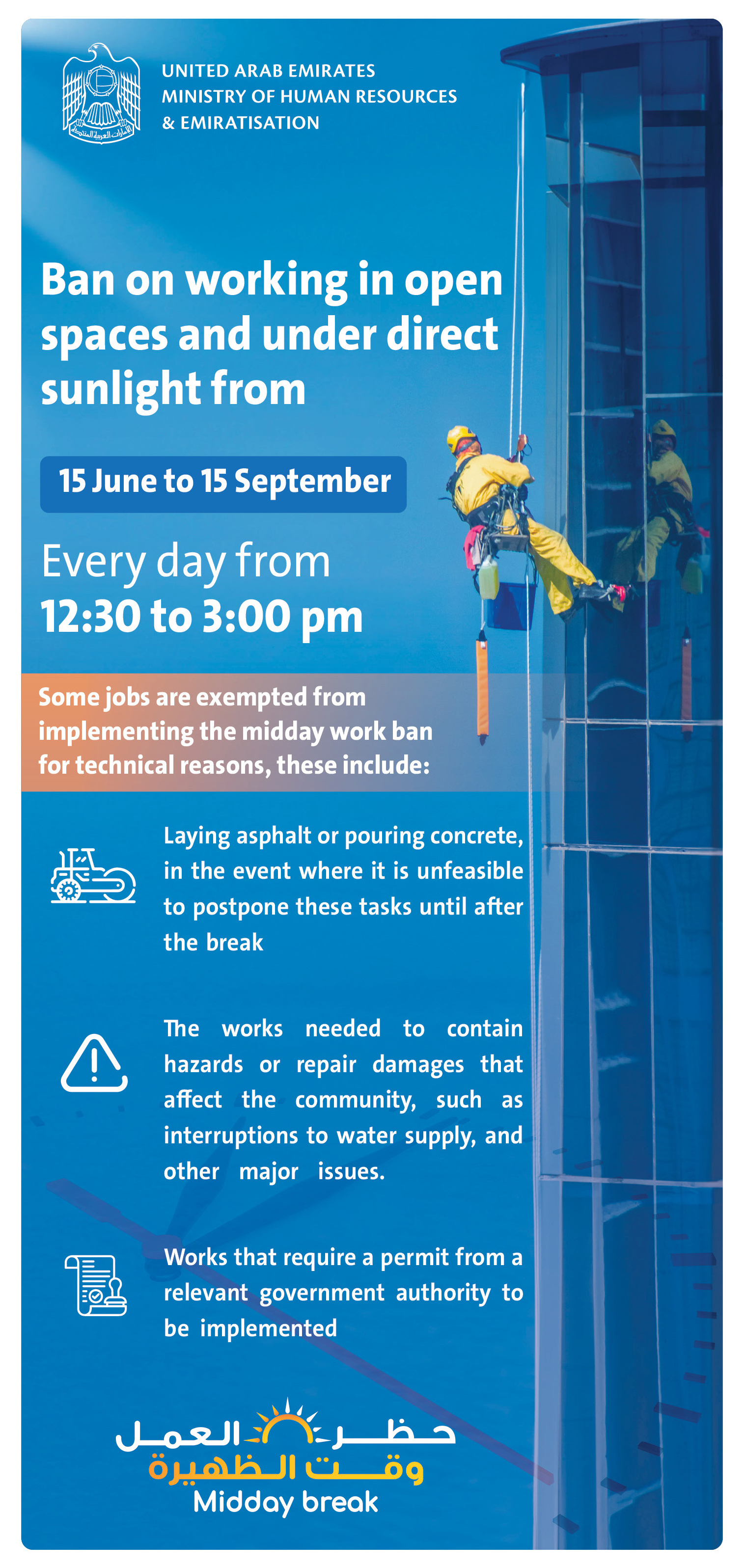 The Ministry of Human Resources and Emiratisation (MoHRE) will begin implementing the Midday Break from tomorrow, 15 June until 15 September 2023. The ban will prohibit work in open spaces or under direct sunlight from 12:30 to 3:00 pm.
