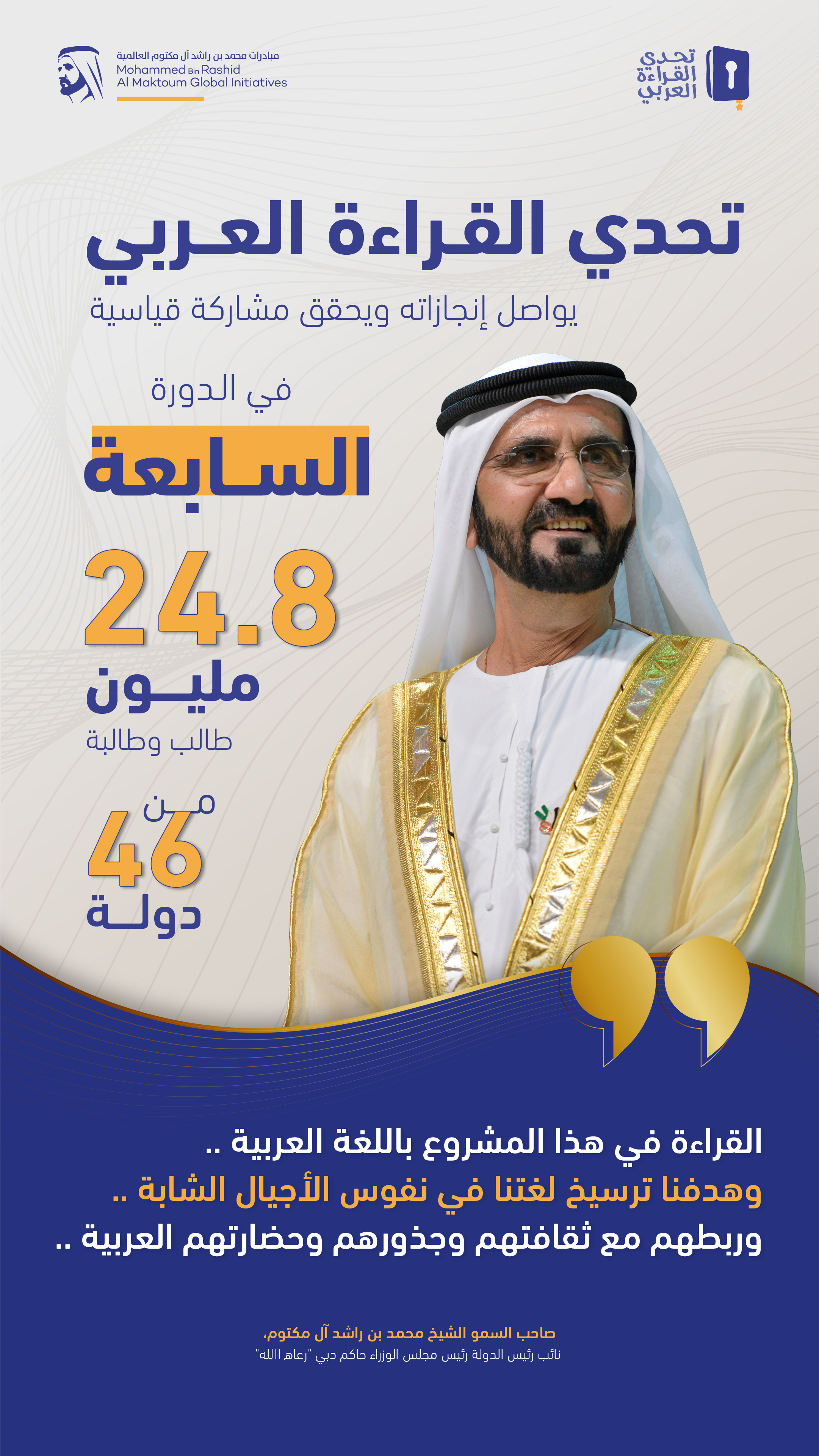 “The Arab Reading Challenge, launched by H.H. Sheikh Mohammed bin Rashid Al Maktoum 7 years ago, has become a milestone for developing reading and accumulating knowledge. It has also become a great motivation to dive deeper into the beauty of the Arabic language and its vast potential to accommodate modern sciences.