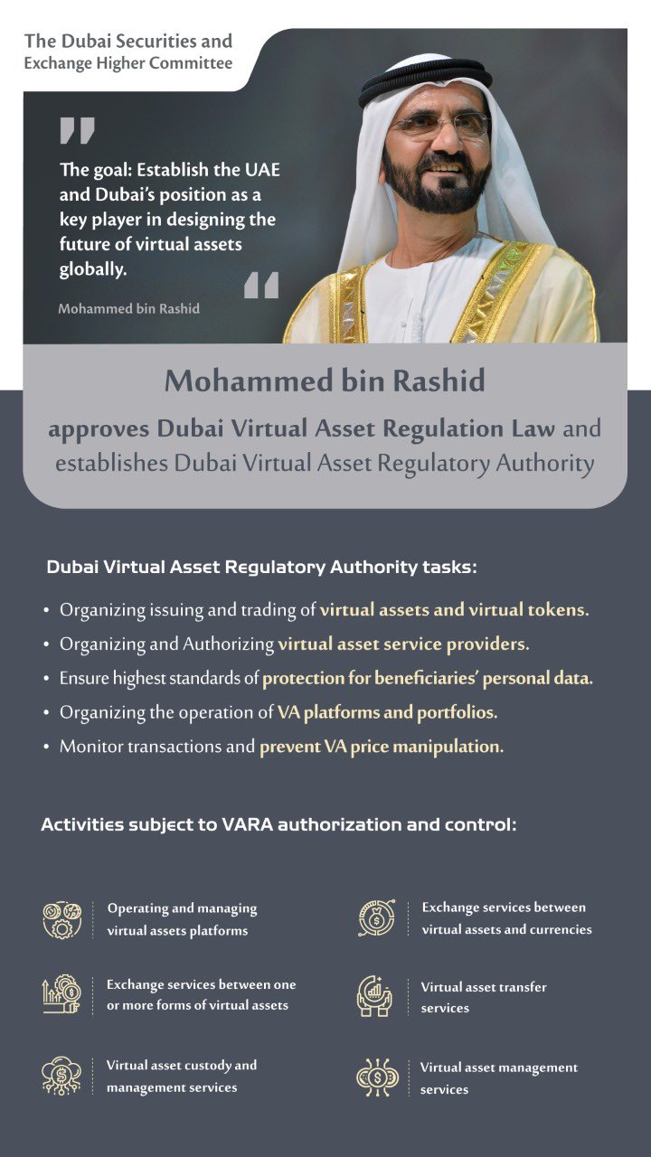 In his capacity as the Ruler of Dubai, His Highness Sheikh Mohammed bin Rashid Al Maktoum, Vice President and Prime Minister, issued the Dubai Virtual Asset Regulation Law aimed at creating an advanced legal framework to protect investors and designing much-warranted international standards for virtual assets (VA) industry governance that will promote responsible business growth, under prudential regulations.