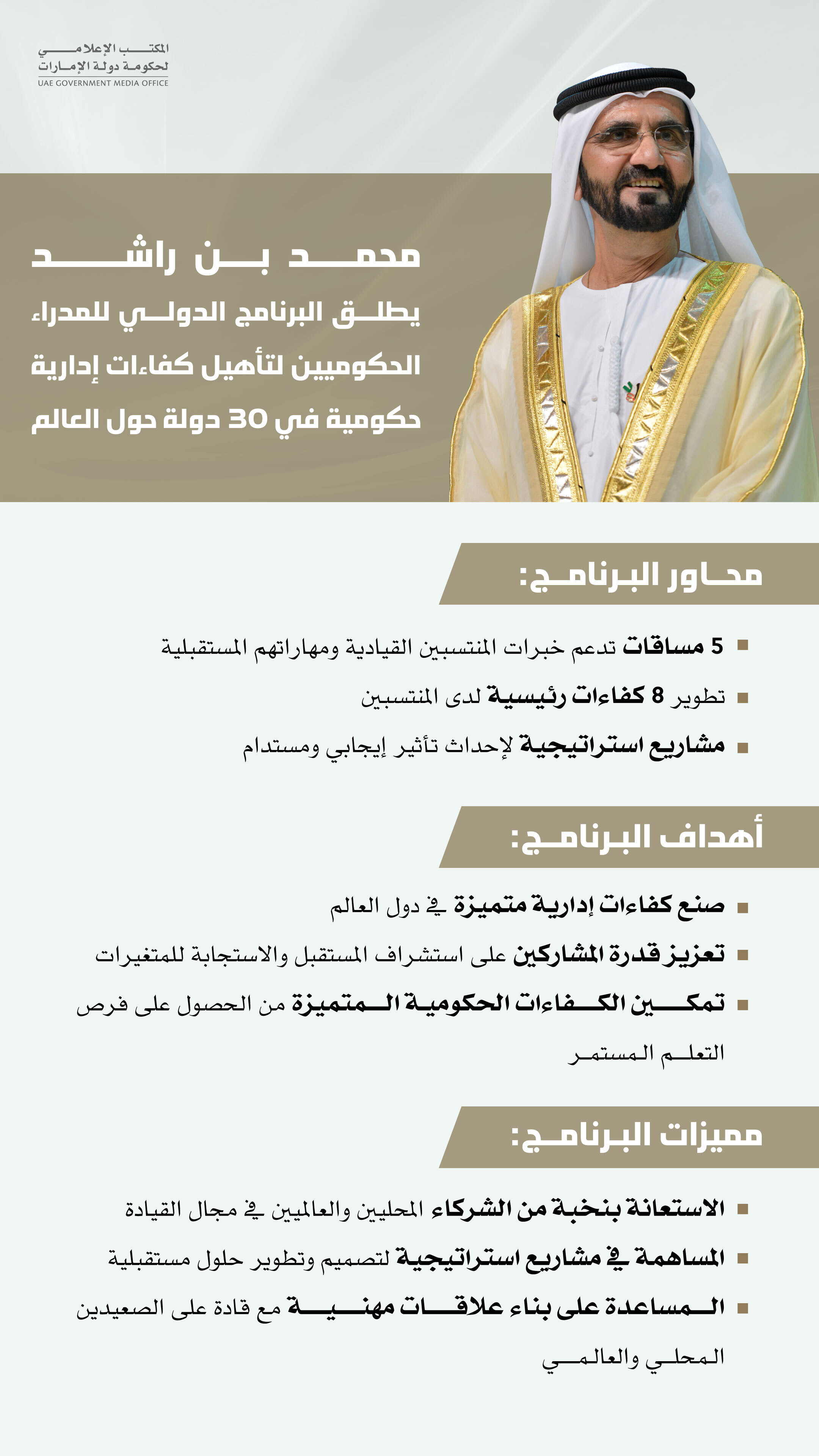 The programme seeks to build knowledge bridges with diverse governments throughout the world and export Emirati competence in government management to 30 nations around the world.