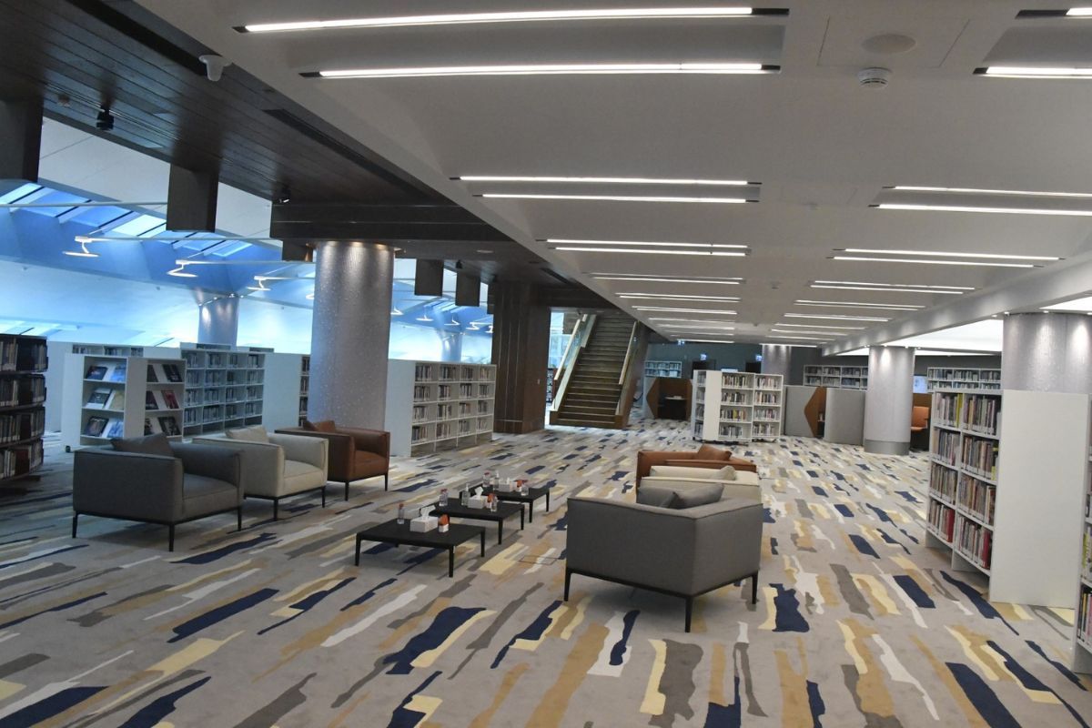 The automated storage and electronic book retrieval system on the library’s first floor is one of its largest sections. It contains over one million titles and utilises a first-of-its-kind smart system in the Middle East region that uses AI to send commands to robots to locate books and deliver them to readers wherever they are in the different libraries spread across seven storeys.