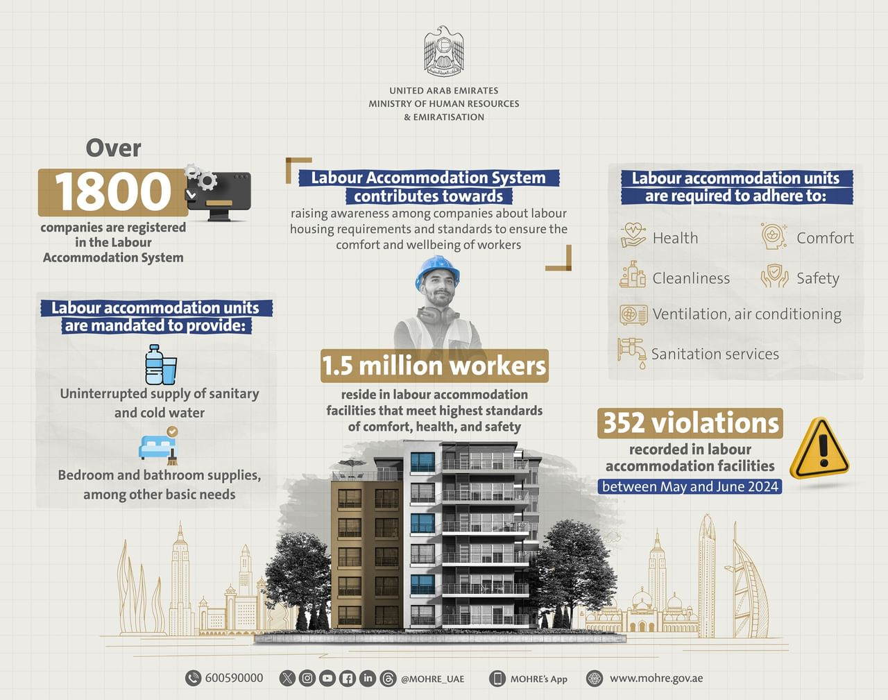 MoHRE continues to urge companies employing 50 or more workers to register in the Labour Accommodation System and adhere to housing standards, highlighting the importance of worker well-being in promoting a productive and competitive labour market.