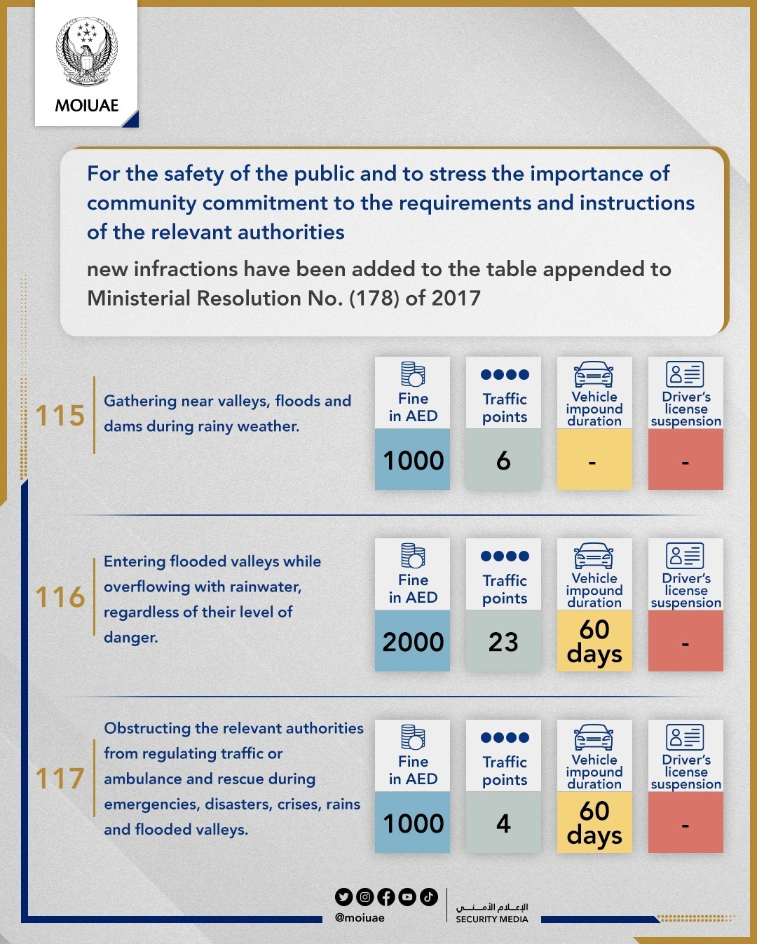 - Article (114) imposes a fine of AED 2,000, 23 traffic points, and a vehicle impoundment period of 60 days for the violation of “entering valleys while they are flowing with rainwater, whatever the level of severity.”
