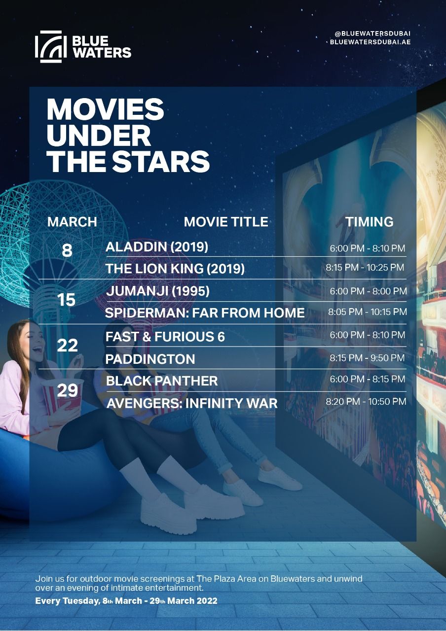 Go over with your family and friends to unwind with a bit of mid-week excitement – at an outdoor movie screening in The Plaza, before enjoying a pick of global cuisines at Bluewaters.