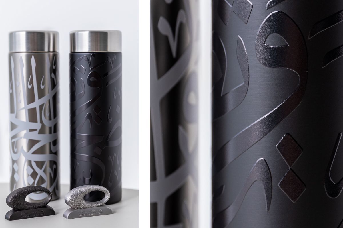 Locally inspired products include those from the Calligraphy collection. They are beautifully decorated in Arabic calligraphy (the cursive script also known as thuluth is the same one wrapped around the building) inspired by quotes from His Highness Sheikh Mohammed bin Rashid Al Maktoum, Vice President, Prime Minister and Ruler of Dubai, which embodies the spirit of the museum and its mission.