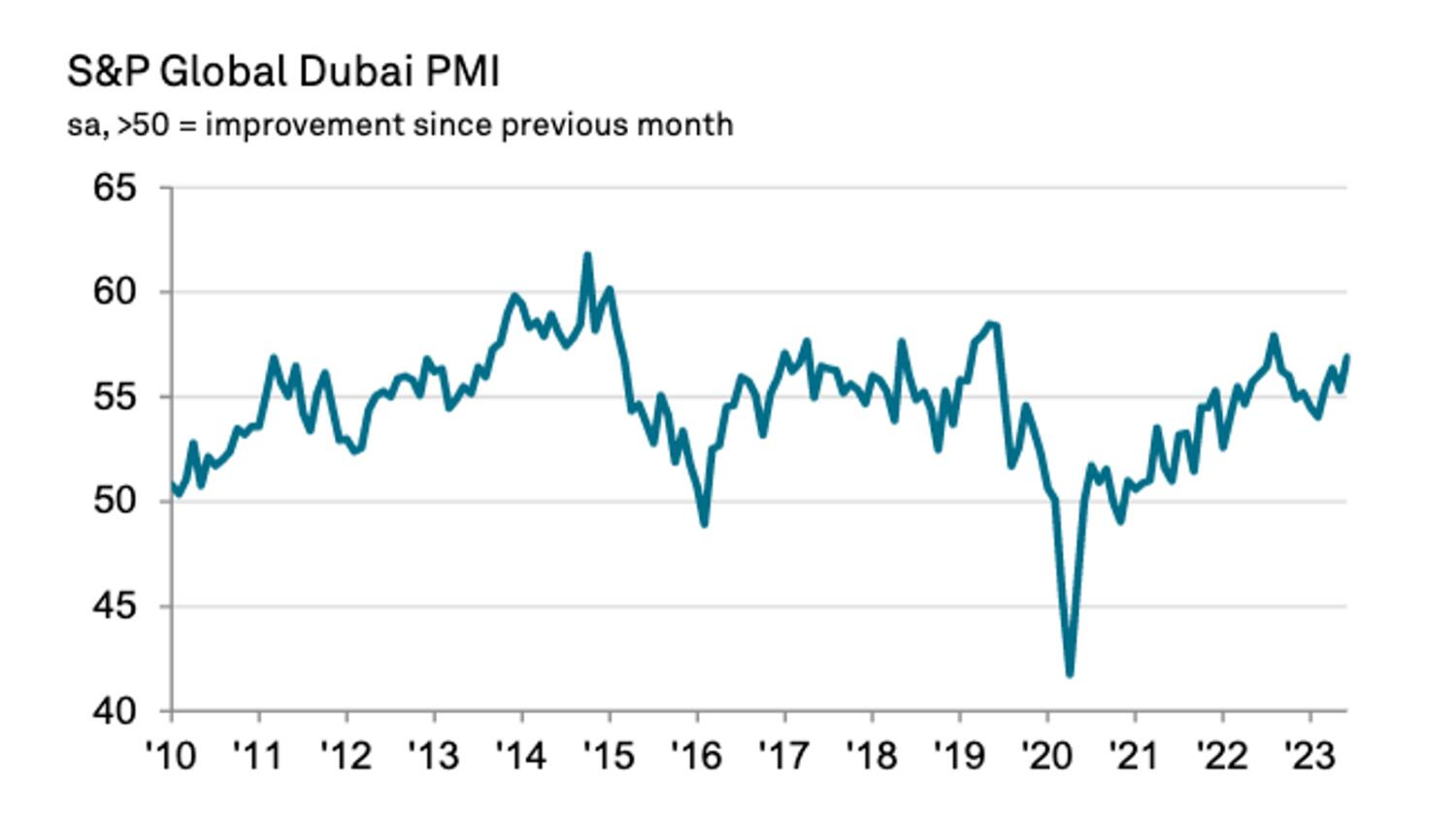 The headline S&P Global Dubai Purchasing Managers’ Index (PMI) rose to 56.9 in June, after a 55.3 reading in May, a statement from S&P Global said.