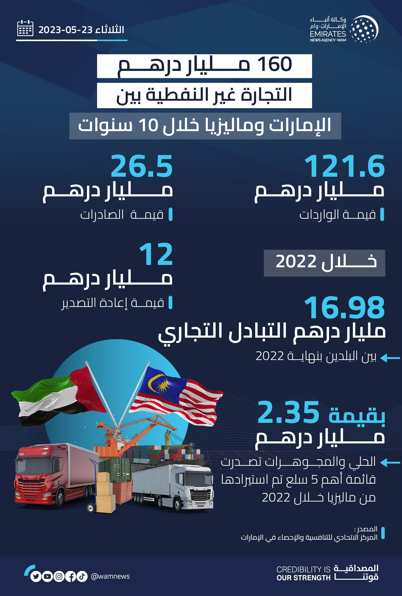 The FCSC's trade report on non-oil foreign trade between the UAE and Malaysia from 2013 to 2022 highlighted a six percent growth, with trade reaching AED 16.98 billion by the end of 2022 compared to AED 16.06 billion in 2021. This indicates a growth rate of 32 percent compared to AED 12.91 billion in 2020.