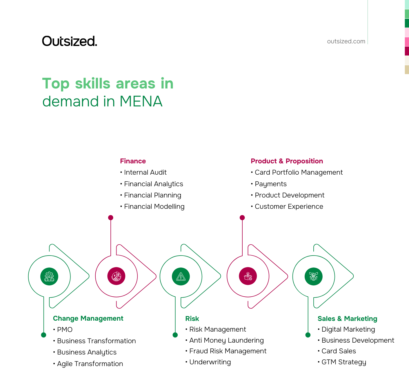 Summarising thousands of data points, the Talent-On-Demand 2024 report identifies the top skills in demand as evidenced by MENA enterprises that have used Outsized. This market is witnessing a diversified demand in response to an influx of major projects like NEOM in KSA, and open immigration policies from countries like the UAE. Unlike the global trend where technology and data analysis dominate, the MENA region shows a broader scope, including Finance, Risk, and areas like Product and Proposition, Sales, Marketing, and Change Management. In 2024, new macro trends such as Environmental Social Governance and sustainability, data analytics, and procurement are expected to rise in importance, which will further accelerate demand for local and international skilled independent talent.