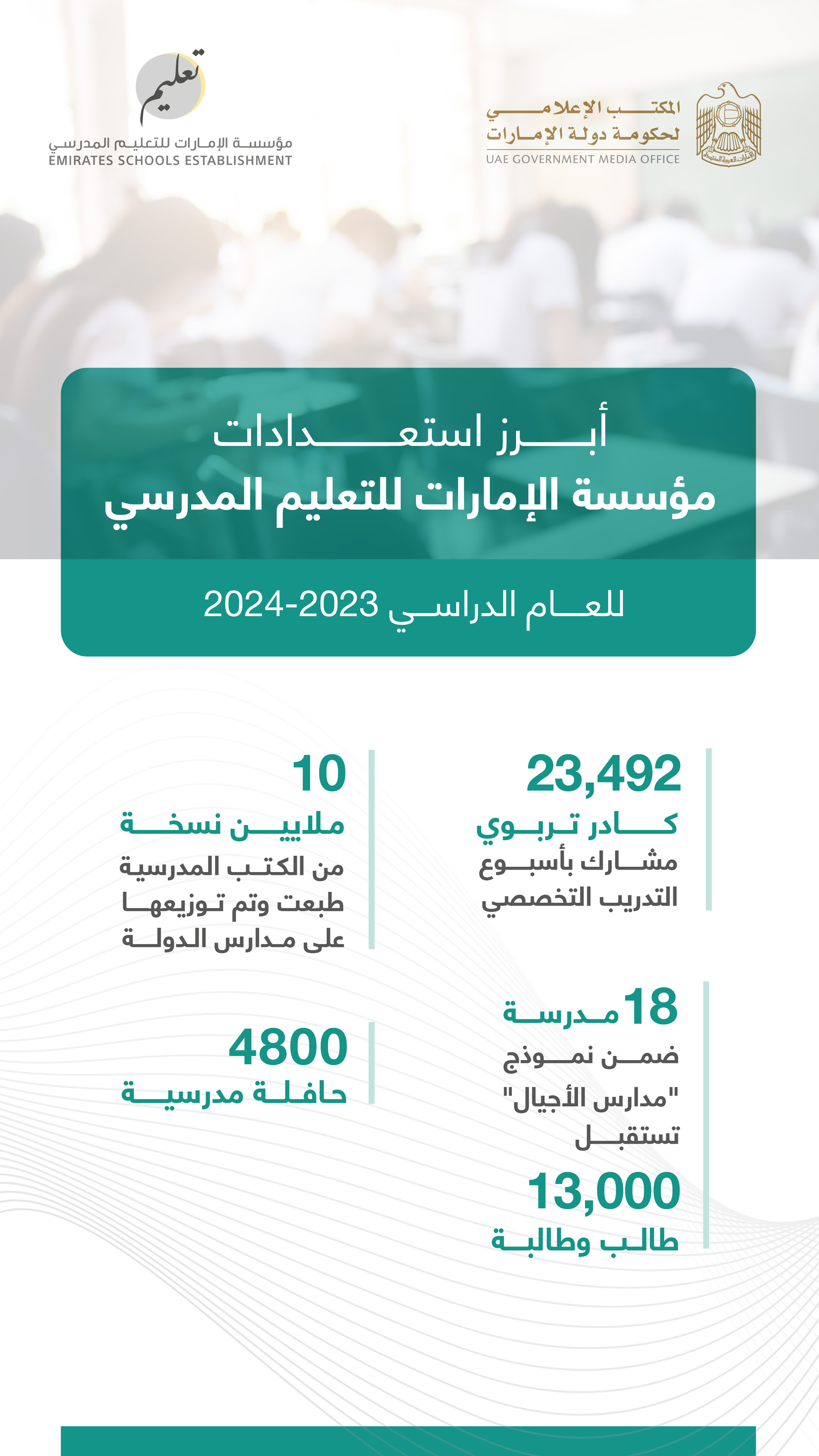 He also mentioned that 3,600 computers will be distributed to students in accordance with the process tying device allocation to progression between the three educational stages. Furthermore, 2,187 interactive display devices will be provided to government schools for use in different subject classes. Approximately 10 million copies of curriculum books have been printed, and public schools across the Emirates will begin distributing them to students on the first day of school. He emphasised that the distribution process will be closely monitored and the highest standards of transparency will be observed.